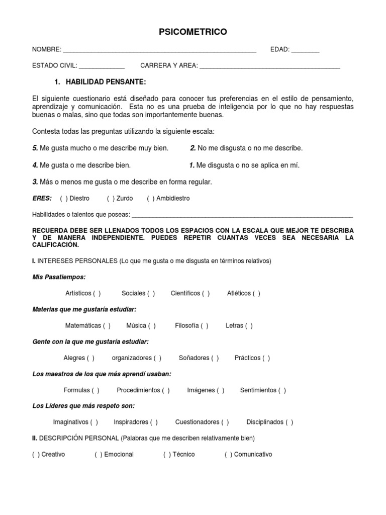 1. HABILIDAD PENSANTE: El siguiente cuestionario est diseado para conocer tus preferencias en el estilo de pensamiento, aprendizaje y comunicacin. Esta no es una prueba de inteligencia por lo que no hay respuestas buenas o malas, sino que todas son importantemente buenas. Contesta todas las preguntas utilizando la siguiente escala: 5. Me gusta mucho o me describe muy bien. 4. Me gusta o me describe bien. 2. No me disgusta o no me describe. 1. Me disgusta o no se aplica en m.