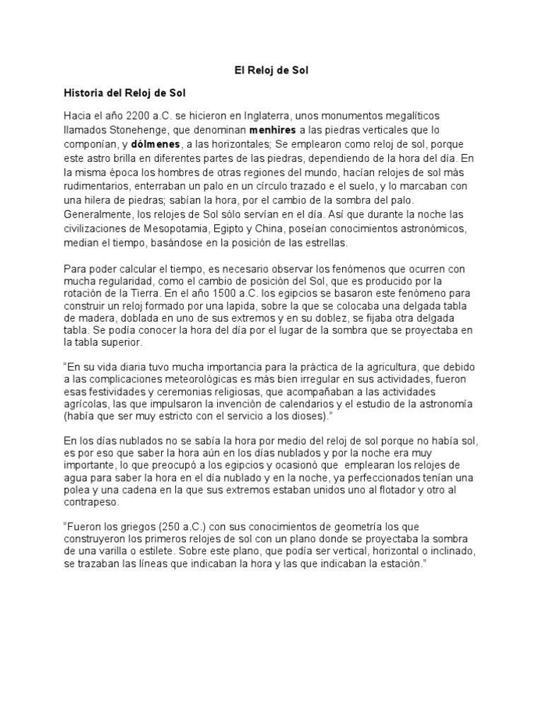 se hicieron en Inglaterra, unos monumentos megalticos llamados Stonehenge, que denominan menhires a las piedras verticales que lo componan, y dlmenes, a las horizontales; Se emplearon como reloj de sol, porque este astro brilla en diferentes partes de las piedras, dependiendo de la hora del da. En la misma poca los hombres de otras regiones del mundo, hacan relojes de sol ms rudimentarios, enterraban un palo en un crculo trazado e el suelo, y lo marcaban con una hilera de piedras; saban la hora, por el cambio de la sombra del palo. Generalmente, los relojes de Sol slo servan en el da. As que durante la noche las civilizaciones de Mesopotamia, Egipto y China, posean conocimientos astronmicos, median el tiempo, basndose en la posicin de las estrellas. Para poder calcular el tiempo, es necesario observar los fenmenos que ocurren con mucha regularidad, como el cambio de posicin del Sol, que es producido por la rotacin de la Tierra. En el ao 1500 a.C. los egipcios se basaron este fenmeno para construir un reloj formado por una lapida, sobre la que se colocaba una delgada tabla de madera, doblada en uno de sus extremos y en su doblez, se fijaba otra delgada tabla. Se poda conocer la hora del da por el lugar de la sombra que se proyectaba en la tabla superior. En su vida diaria tuvo mucha importancia para la prctica de la agricultura, que debido a las complicaciones meteorolgicas es ms bien irregular en sus actividades, fueron esas festividades y ceremonias religiosas, que acompaaban a las actividades agrcolas, las que impulsaron la invencin de calendarios y el estudio de la astronoma (haba que ser muy estricto con el servicio a los dioses). En los das nublados no se saba la hora por medio del reloj de sol porque no haba sol, es por eso que saber la hora an en los das nublados y por la noche era muy importante, lo que preocup a los egipcios y ocasion que emplearan los relojes de agua para saber la hora en el da nublado y en la noche, ya perfeccionados tenan una polea y una cadena en la que sus extremos estaban unidos uno al flotador y otro al contrapeso. Fueron los griegos (250 a.C.) con sus conocimientos de geometra los que construyeron los primeros relojes de sol con un plano donde se proyectaba la sombra de una varilla o estilete. Sobre este plano, que poda ser vertical, horizontal o inclinado, se trazaban las lneas que indicaban la hora y las que indicaban la estacin.