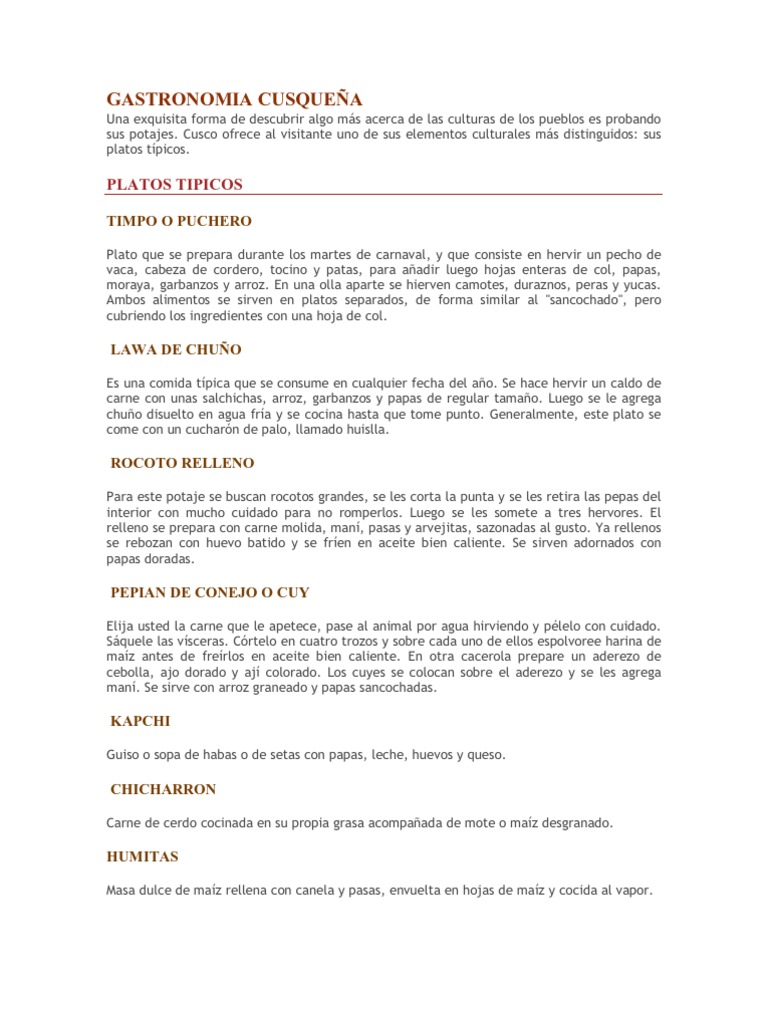 Una exquisita forma de descubrir algo ms acerca de las culturas de los pueblos es probando sus potajes. Cusco ofrece al visitante uno de sus elementos culturales ms distinguidos: sus platos tpicos.