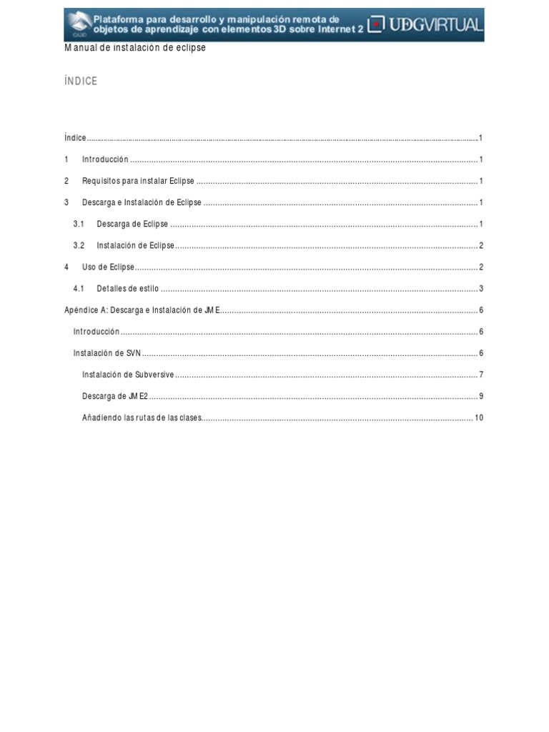 ndice.1 1 2 3 Introduccin ................................................................................................................................................... 1 Requisitos para instalar Eclipse ....................................................................................................................... 1 Descarga e Instalacin de Eclipse .................................................................................................................... 1 3.1 3.2 4 Descarga de Eclipse .................................................................................................................................. 1 Instalacin de Eclipse ................................................................................................................................ 2