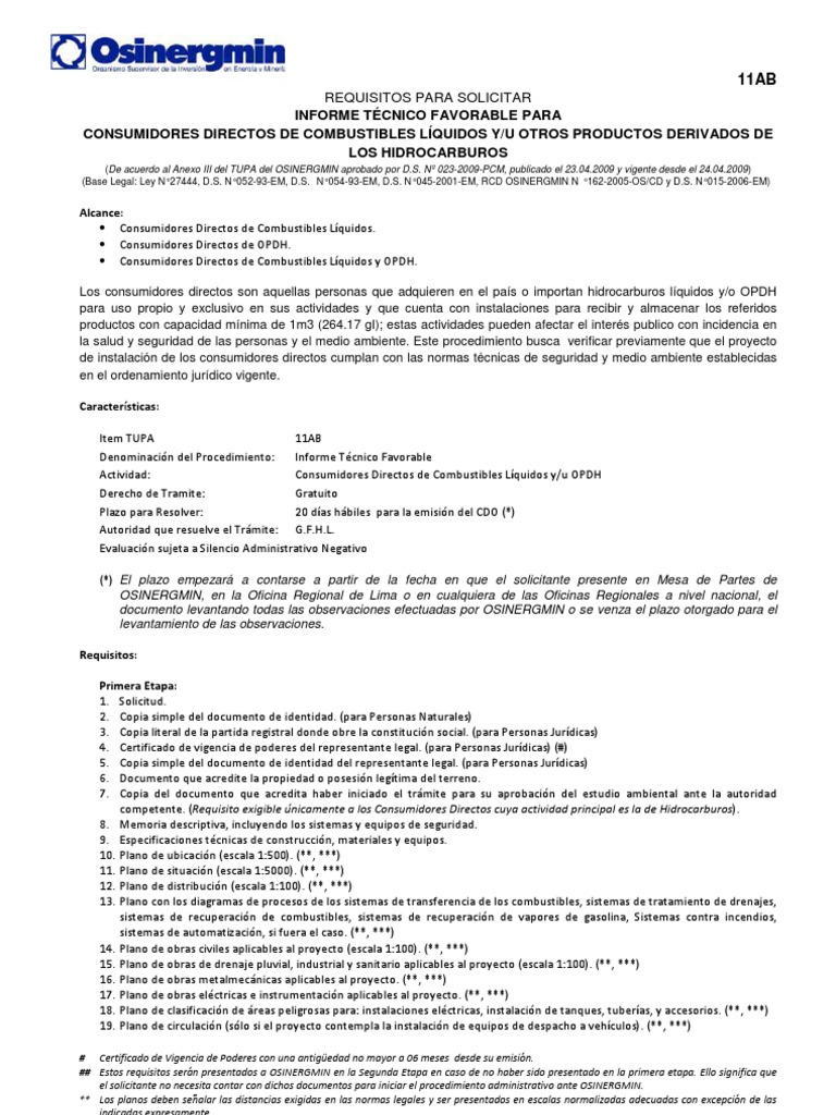 Alcance: Consumidores Directos de Combustibles Lquidos. Consumidores Directos de OPDH. Consumidores Directos de Combustibles Lquidos y OPDH. Los consumidores directos son aquellas personas que adquieren en el pas o importan hidrocarburos lquidos y/o OPDH para uso propio y exclusivo en sus actividades y que cuenta con instalaciones para recibir y almacenar los referidos productos con capacidad mnima de 1m3 (264.17 gl); estas actividades pueden afectar el inters publico con incidencia en la salud y seguridad de las personas y el medio ambiente. Este procedimiento busca verificar previamente que el proyecto de instalacin de los consumidores directos cumplan con las normas tcnicas de seguridad y medio ambiente establecidas en el ordenamiento jurdico vigente. Caractersticas: Item TUPA 11AB Denominacin del Procedimiento: Informe Tcnico Favorable Actividad: Consumidores Directos de Combustibles Lquidos y/u OPDH Derecho de Tramite: Gratuito Plazo para Resolver: 20 das hbiles para la emisin del CDO (*) Autoridad que resuelve el Trmite: G.F.H.L. Evaluacin sujeta a Silencio Administrativo Negativo (*) El plazo empezar a contarse a partir de la fecha en que el solicitante presente en Mesa de Partes de OSINERGMIN, en la Oficina Regional de Lima o en cualquiera de las Oficinas Regionales a nivel nacional, el documento levantando todas las observaciones efectuadas por OSINERGMIN o se venza el plazo otorgado para el levantamiento de las observaciones. Requisitos: Primera Etapa: 1. Solicitud. 2. Copia simple del documento de identidad. (para Personas Naturales) 3. Copia literal de la partida registral donde obre la constitucin social. (para Personas Jurdicas) 4. Certificado de vigencia de poderes del representante legal. (para Personas Jurdicas) (#) 5. Copia simple del documento de identidad del representante legal. (para Personas Jurdicas) 6. Documento que acredite la propiedad o posesin legtima del terreno. 7. Copia del documento que acredita haber iniciado el trmite para su aprobacin del estudio ambiental ante la autoridad competente. (Requisito exigible nicamente a los Consumidores Directos cuya actividad principal es la de Hidrocarburos). 8. Memoria descriptiva, incluyendo los sistemas y equipos de seguridad. 9. Especificaciones tcnicas de construccin, materiales y equipos. 10. Plano de ubicacin (escala 1:500). (**, ***) 11. Plano de situacin (escala 1:5000). (**, ***) 12. Plano de distribucin (escala 1:100). (**, ***) 13. Plano con los diagramas de procesos de los sistemas de transferencia de los combustibles, sistemas de tratamiento de drenajes, sistemas de recuperacin de combustibles, sistemas de recuperacin de vapores de gasolina, Sistemas contra incendios, sistemas de automatizacin, si fuera el caso. (**, ***) 14. Plano de obras civiles aplicables al proyecto (escala 1:100). (**, ***) 15. Plano de obras de drenaje pluvial, industrial y sanitario aplicables al proyecto (escala 1:100). (**, ***) 16. Plano de obras metalmecnicas aplicables al proyecto. (**, ***) 17. Plano de obras elctricas e instrumentacin aplicables al proyecto. (**, ***) 18. Plano de clasificacin de reas peligrosas para: instalaciones elctricas, instalacin de tanques, tuberas, y accesorios. (**, ***) 19. Plano de circulacin (slo si el proyecto contempla la instalacin de equipos de despacho a vehculos). (**, ***)