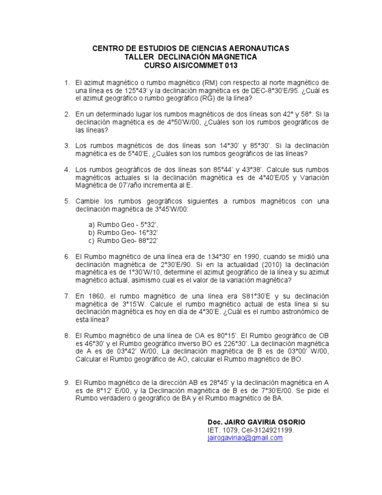 CENTRO DE ESTUDIOS DE CIENCIAS AERONAUTICAS TALLER DECLINACIN MAGNETICA CURSO AIS/COM/MET 013
