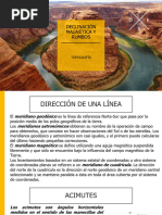 1. El azimut magntico o rumbo magntico (RM) con respecto al norte magntico de una lnea es de 12543 y la declinacin magntica es de DEC-830E/95. Cul es el azimut geogrfico o rumbo geogrfico (RG) de la lnea? 2. En un determinado lugar los rumbos magnticos de dos lneas son 42 y 58. Si la declinacin magntica es de 450W/00, Cules son los rumbos geogrficos de las lneas? 3. Los rumbos magnticos de dos lneas son 1430 y 8530. Si la declinacin magntica es de 540E, Cules son los rumbos geogrficos de las lneas? 4. Los rumbos geogrficos de dos lneas son 8544 y 4338. Calcule sus rumbos magnticos actuales si la declinacin magntica es de 440E/05 y Variacin Magntica de 07/ao incrementa al E. 5. Cambie los rumbos geogrficos siguientes a rumbos magnticos con una declinacin magntica de 345W/00: a) Rumbo Geo - 532, b) Rumbo Geo- 1632 c) Rumbo Geo- 8822 6. El Rumbo magntico de una lnea era de 13430 en 1990, cuando se midi una declinacin magntica de 230E/90. Si en la actualidad (2010) la declinacin magntica es de 130W/10, determine el azimut geogrfico de la lnea y su azimut magntico actual, asimismo cual es el valor de la variacin magntica? 7. En 1860, el rumbo magntico de una lnea era S8130E y su declinacin magntica de 315W. Calcule el rumbo magntico actual de esta lnea si su declinacin magntica es hoy en da de 430E. Cul es el rumbo astronmico de esta lnea? 8. El Rumbo magntico de una lnea de OA es 8015. El Rumbo geogrfico de OB es 4630 y el Rumbo geogrfico inverso BO es 22630. La declinacin magntica de A es de 0342 W/00, La declinacin magntica de B es de 0300 W/00, Calcular el Rumbo geogrfico de AO, calcular el Rumbo magntico de BO. 9. El Rumbo magntico de la direccin AB es 2845 y la declinacin magntica en A es de 812 E/00, y la Declinacin magntica de B es de 730E/00. Se pide el Rumbo verdadero o geogrfico de BA y el Rumbo magntico de BA. Doc. JAIRO GAVIRIA OSORIO IET. 1079, Cel-3124921199. jairogaviriao@gmail.com