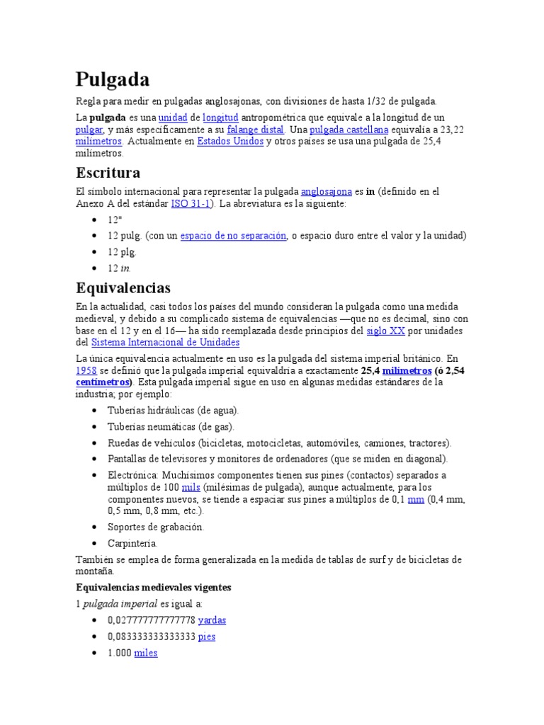 Tambin se emplea de forma generalizada en la medida de tablas de surf y de bicicletas de montaa. Equivalencias medievales vigentes 1 pulgada imperial es igual a: 0,027777777777778 yardas 0,083333333333333 pies 1.000 miles
