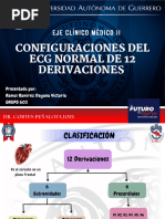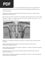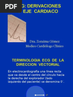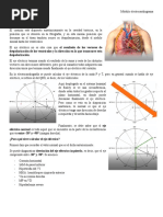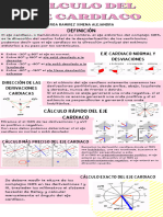 Tema #3 El eje elctrico normal del corazn es de +120 hasta 30, El eje ideal normal es de +60. Entre 1 y 90 el eje esta hacia la izquierda, esto signica que hay hipertroa ventricular derecha; si el eje esta entre +91 y +180 signica hipertroa ventricular izquierda, el eje esta hacia la derecha. Entre 91 y 179 no se sabe para donde esta desviado el eje, se le llama La tierra de nadie. El eje elctrico del corazn se representa por QRS. Para sacar el eje utilizamos las primeras 6 derivaciones, desde DI hasta aVF. Otra cosa que debemos saber son las derivaciones perpendiculares, as decimos que: DI es perpendicular a aVF, DII es perpendicular a aVR, DIII es perpendicular a aVL. Se dice que una derivacin es perpendicular cuando esta a 90 de distancia de la otra. Pasos para sacar el eje: 1) Debemos buscar el QRS mas isodifsico en las 6 derivaciones, una onda es isodifsica cuando al restar lo positivo con lo negativo el resultado da cero, o en su defecto lo ms cercano a cero. 2) Buscar la perpendicular a la derivacin ms isodifsica, el eje estar en la derivacin perpendicular. 3) Ver si aVF esta positivo o negativo, con esto podemos ubicarnos en que parte del eje hexaaxial se encuentra el eje que buscamos. Otro mtodo para sacar el eje es buscar la derivacin que contenga el QRS ms grande, es decir, el de mayor voltaje, en esta derivacin estar el eje. En el caso que todas las derivaciones estn isodifsicas, el eje esta perpendicular al plano frontal y es un eje indeterminado.