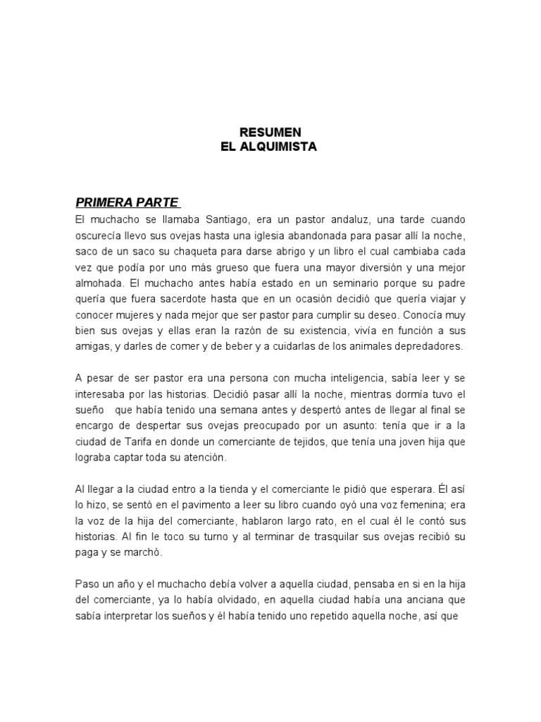 El muchacho se llamaba Santiago, era un pastor andaluz, una tarde cuando oscureca llevo sus ovejas hasta una iglesia abandonada para pasar all la noche, saco de un saco su chaqueta para darse abrigo y un libro el cual cambiaba cada vez que poda por uno ms grueso que fuera una mayor diversin y una mejor almohada. El muchacho antes haba estado en un seminario porque su padre quera que fuera sacerdote hasta que en un ocasin decidi que quera viajar y conocer mujeres y nada mejor que ser pastor para cumplir su deseo. Conoca muy bien sus ovejas y ellas eran la razn de su existencia, viva en funcin a sus amigas, y darles de comer y de beber y a cuidarlas de los animales depredadores. A pesar de ser pastor era una persona con mucha inteligencia, saba leer y se interesaba por las historias. Decidi pasar all la noche, mientras dorma tuvo el sueo que haba tenido una semana antes y despert antes de llegar al final se encargo de despertar sus ovejas preocupado por un asunto: tena que ir a la ciudad de Tarifa en donde un comerciante de tejidos, que tena una joven hija que lograba captar toda su atencin. Al llegar a la ciudad entro a la tienda y el comerciante le pidi que esperara. l as lo hizo, se sent en el pavimento a leer su libro cuando oy una voz femenina; era la voz de la hija del comerciante, hablaron largo rato, en el cual l le cont sus historias. Al fin le toco su turno y al terminar de trasquilar sus ovejas recibi su paga y se march. Paso un ao y el muchacho deba volver a aquella ciudad, pensaba en si en la hija del comerciante, ya lo haba olvidado, en aquella ciudad haba una anciana que saba interpretar los sueos y l haba tenido uno repetido aquella noche, as que