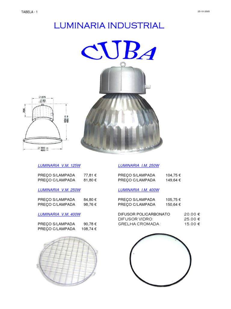 LUMINARIA I.M. 70W PREO S/LAMPADA PREO C/LAMPADA LUMINARIA I.M. 150W PREO S/LAMPADA PREO C/LAMPADA LUMINARIA I.M. 250W PREO S/LAMPADA PREO C/LAMPADA 103,00 118,00 99,00 114,00 88,00 104,00