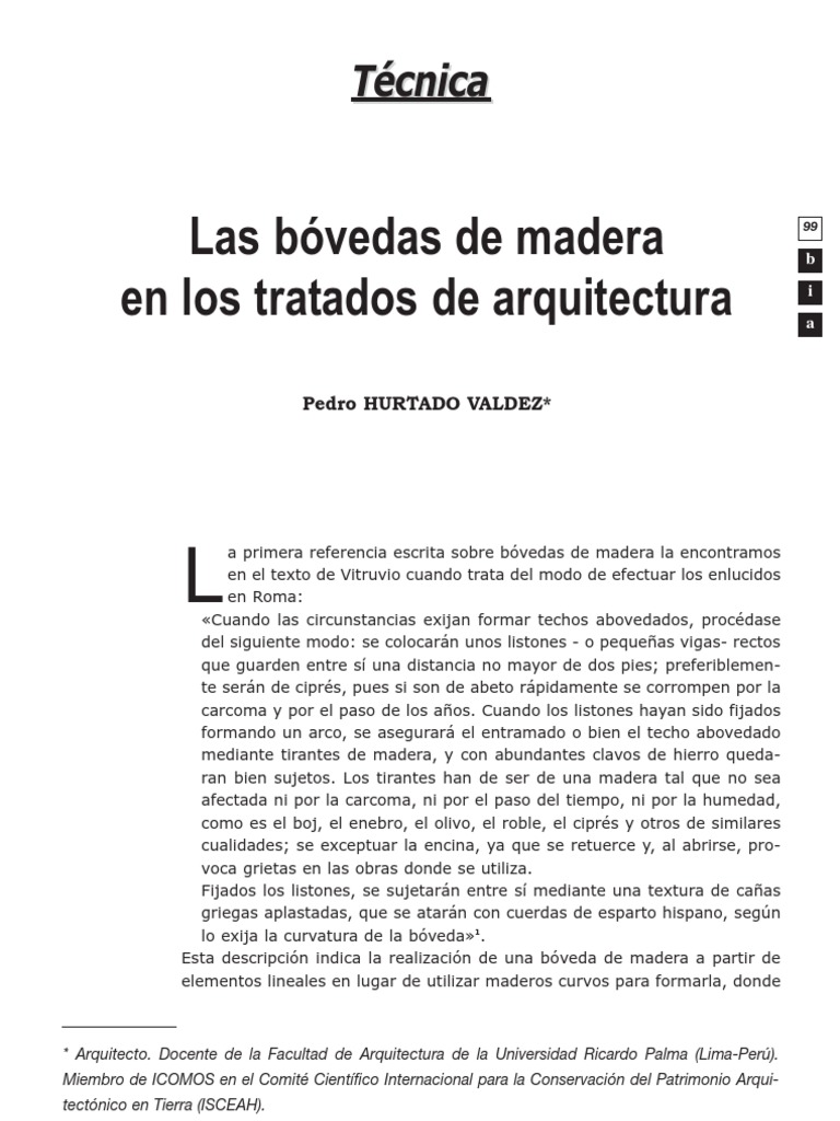 a primera referencia escrita sobre bvedas de madera la encontramos en el texto de Vitruvio cuando trata del modo de efectuar los enlucidos en Roma: Cuando las circunstancias exijan formar techos abovedados, procdase del siguiente modo: se colocarn unos listones - o pequeas vigas- rectos que guarden entre s una distancia no mayor de dos pies; preferiblemente sern de ciprs, pues si son de abeto rpidamente se corrompen por la carcoma y por el paso de los aos. Cuando los listones hayan sido fijados formando un arco, se asegurar el entramado o bien el techo abovedado mediante tirantes de madera, y con abundantes clavos de hierro quedaran bien sujetos. Los tirantes han de ser de una madera tal que no sea afectada ni por la carcoma, ni por el paso del tiempo, ni por la humedad, como es el boj, el enebro, el olivo, el roble, el ciprs y otros de similares cualidades; se exceptuar la encina, ya que se retuerce y, al abrirse, provoca grietas en las obras donde se utiliza. Fijados los listones, se sujetarn entre s mediante una textura de caas griegas aplastadas, que se atarn con cuerdas de esparto hispano, segn lo exija la curvatura de la bveda1. Esta descripcin indica la realizacin de una bveda de madera a partir de elementos lineales en lugar de utilizar maderos curvos para formarla, donde