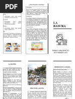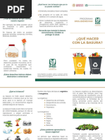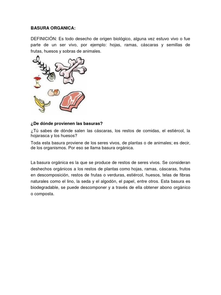 De dnde provienen las basuras? T sabes de dnde salen las cscaras, los restos de comidas, el estircol, la hojarasca y los huesos? Toda esta basura proviene de los seres vivos, de plantas o de animales; es decir, de los organismos. Por eso se llama basura orgnica. La basura orgnica es la que se produce de restos de seres vivos. Se consideran deshechos orgnicos a los restos de plantas como hojas, ramas, cscaras, frutos en descomposicin, restos de frutas o verduras, estircol, huesos, telas de fibras naturales como el lino, la seda y el algodn, el papel, entre otros. Esta basura es biodegradable, se puede descomponer y a travs de ella obtener abono orgnico o composta.