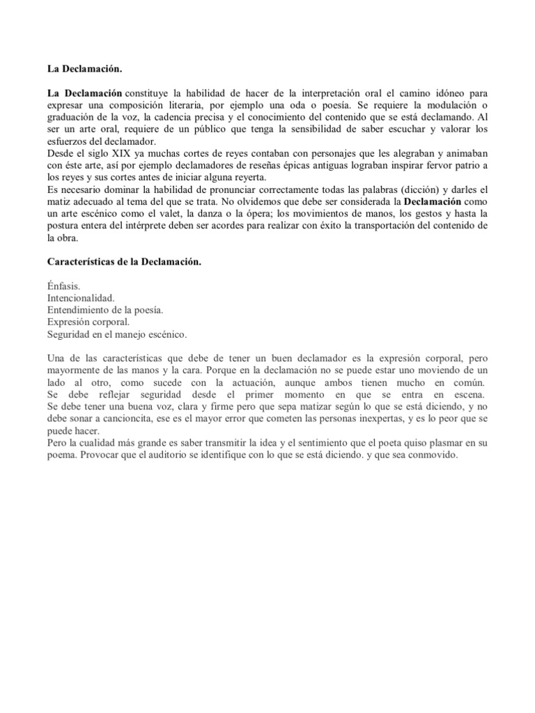 La Declamacin constituye la habilidad de hacer de la interpretacin oral el camino idneo para expresar una composicin literaria, por ejemplo una oda o poesa. Se requiere la modulacin o graduacin de la voz, la cadencia precisa y el conocimiento del contenido que se est declamando. Al ser un arte oral, requiere de un pblico que tenga la sensibilidad de saber escuchar y valorar los esfuerzos del declamador. Desde el siglo XIX ya muchas cortes de reyes contaban con personajes que les alegraban y animaban con ste arte, as por ejemplo declamadores de reseas picas antiguas lograban inspirar fervor patrio a los reyes y sus cortes antes de iniciar alguna reyerta. Es necesario dominar la habilidad de pronunciar correctamente todas las palabras (diccin) y darles el matiz adecuado al tema del que se trata. No olvidemos que debe ser considerada la Declamacin como un arte escnico como el valet, la danza o la pera; los movimientos de manos, los gestos y hasta la postura entera del intrprete deben ser acordes para realizar con xito la transportacin del contenido de la obra. Caractersticas de la Declamacin. nfasis. Intencionalidad. Entendimiento de la poesa. Expresin corporal. Seguridad en el manejo escnico. Una de las caractersticas que debe de tener un buen declamador es la expresin corporal, pero mayormente de las manos y la cara. Porque en la declamacin no se puede estar uno moviendo de un lado al otro, como sucede con la actuacin, aunque ambos tienen mucho en comn. Se debe reflejar seguridad desde el primer momento en que se entra en escena. Se debe tener una buena voz, clara y firme pero que sepa matizar segn lo que se est diciendo, y no debe sonar a cancioncita, ese es el mayor error que cometen las personas inexpertas, y es lo peor que se puede hacer. Pero la cualidad ms grande es saber transmitir la idea y el sentimiento que el poeta quiso plasmar en su poema. Provocar que el auditorio se identifique con lo que se est diciendo. y que sea conmovido.
