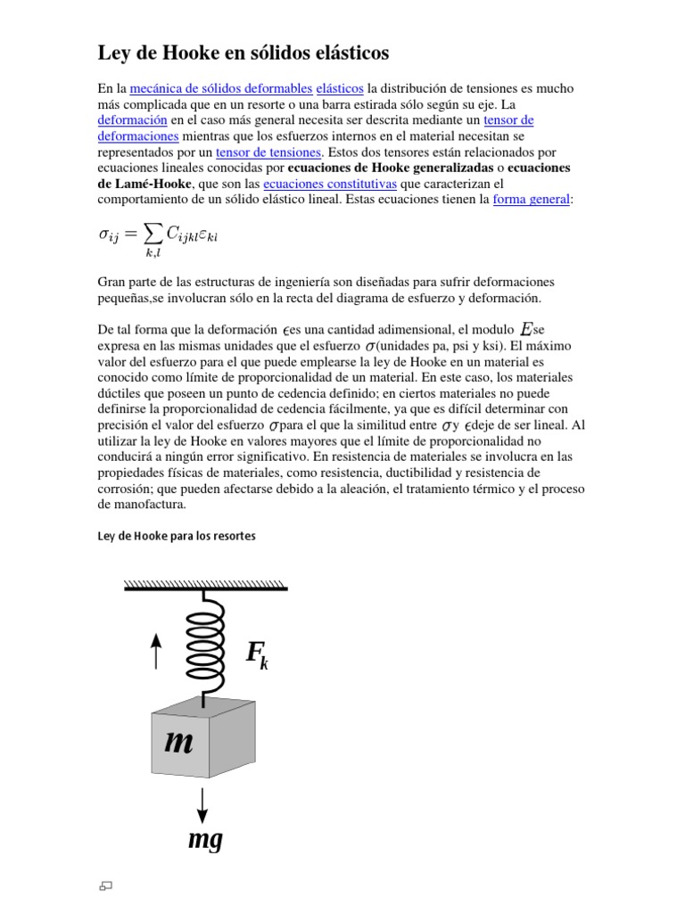 Gran parte de las estructuras de ingeniera son diseadas para sufrir deformaciones pequeas,se involucran slo en la recta del diagrama de esfuerzo y deformacin. De tal forma que la deformacin es una cantidad adimensional, el modulo se expresa en las mismas unidades que el esfuerzo (unidades pa, psi y ksi). El mximo valor del esfuerzo para el que puede emplearse la ley de Hooke en un material es conocido como lmite de proporcionalidad de un material. En este caso, los materiales dctiles que poseen un punto de cedencia definido; en ciertos materiales no puede definirse la proporcionalidad de cedencia fcilmente, ya que es difcil determinar con precisin el valor del esfuerzo para el que la similitud entre y deje de ser lineal. Al utilizar la ley de Hooke en valores mayores que el lmite de proporcionalidad no conducir a ningn error significativo. En resistencia de materiales se involucra en las propiedades fsicas de materiales, como resistencia, ductibilidad y resistencia de corrosin; que pueden afectarse debido a la aleacin, el tratamiento trmico y el proceso de manofactura.