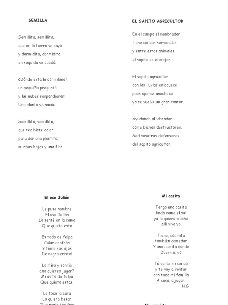 Mi casita Tengo una casita linda como el sol yo la quiero mucho all vivo yo Tiene, cocinita tambin comedor Y una camita donde Duermo, yo T sers mi amigo y te voy a invitar con toda mi familia A casa, a jugar. H.G