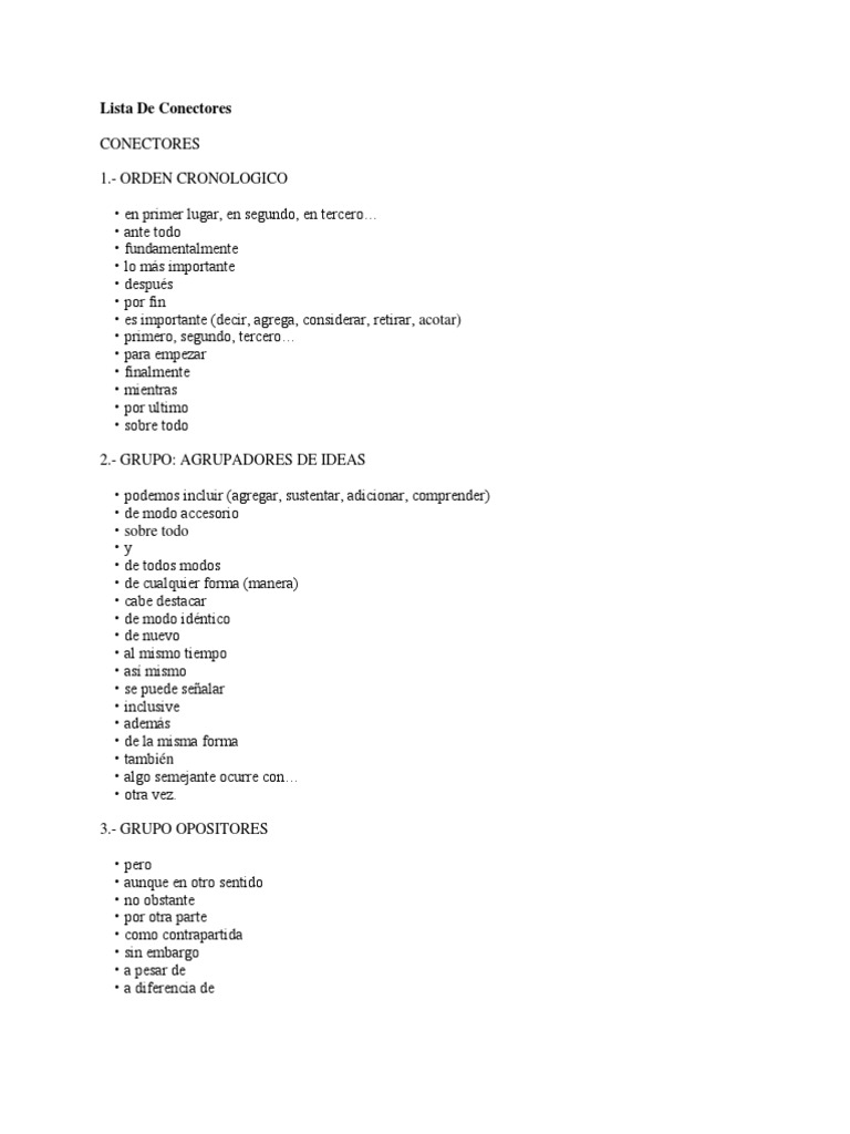 - ORDEN CRONOLOGICO en primer lugar, en segundo, en tercero ante todo fundamentalmente lo ms importante despus por fin es importante (decir, agrega, considerar, retirar, acotar) primero, segundo, tercero para empezar finalmente mientras por ultimo sobre todo 2.- GRUPO: AGRUPADORES DE IDEAS podemos incluir (agregar, sustentar, adicionar, comprender) de modo accesorio sobre todo y de todos modos de cualquier forma (manera) cabe destacar de modo idntico de nuevo al mismo tiempo as mismo se puede sealar inclusive adems de la misma forma tambin algo semejante ocurre con otra vez. 3.- GRUPO OPOSITORES pero aunque en otro sentido no obstante por otra parte como contrapartida sin embargo a pesar de a diferencia de