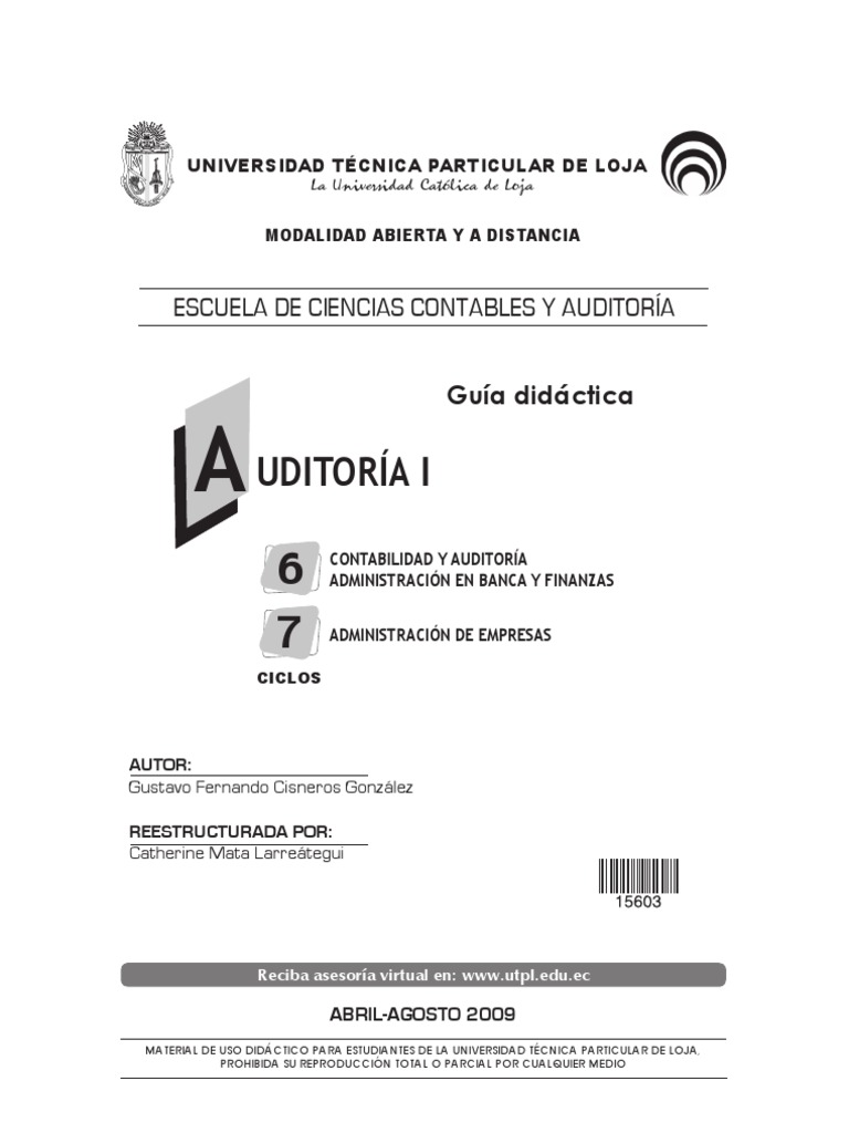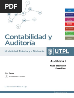 La asignatura de Auditora I se encuentra dentro del perfil curricular de las carreras de, Administracin en Gestin Pblica, Contabilidad y Auditora, Banca y Finanzas, Administracin de Empresas; y Ciencias de la Educacin especialidad contabilidad y administracin, la misma que se la ofrece en cuarto, sexto, sptimo y octavo ciclo respectivamente. En el sistema de estudios a distancia el profesor llega a los estudiantes a travs de la gua didctica para establecer la comunicacin pedaggica. La gua didctica de Auditora I est diseada para orientar a los alumnos el estudio comprensivo de los contenidos. La auditora en la actualidad es el mecanismo moderno de que permite el ejercicio de funciones de revisin, control y evaluacin de las operaciones de una empresa de manera profesional, independiente y confiable. Durante el transcurso del presente ciclo aprenderemos cuan importante es la auditora dentro de la estructura orgnica de una empresa, el rol del auditor y como elaborar y presentar un informe de auditora. La presente gua consta de siete unidades, las mismas que fueron divididas en tres unidades en el primer bimestre y cuatro en el segundo bimestre. La primera sobre el papel del contador pblico en la economa, en la que se explica la naturaleza de las auditoras independientes y de la profesin contable, los diversos tipos de auditora y la importancia de la auditora dentro de una empresa. La segunda se refiere a las normas profesionales y su aplicacin. La tercera estudia la tica profesional y su importancia dentro de la profesin. En la cuarta se refiere a la responsabilidad legal del los contadores pblicos certificados. La quinta describe la evidencia y documentacin de auditora, las clases de evidencia y las tcnicas que permiten obtenerla. La sexta hace referencia a la planeacin de la auditora: conexin de los procedimientos de auditora con el riesgo, en el cual se explica las responsabilidades del Contador Pblico cuando planea una auditora, la forma como los auditores evalan el riesgo del cliente y el diseo de programas, el concepto y la importancia que tienen dentro de una auditora. La sptima analiza el control interno, dentro de la cual se hace estudio de sus componentes y se aplica las tcnicas que se utiliza para su evaluacin. Cabe indicar que los estudiantes deben revisar el texto bsico, de acuerdo a las orientaciones de esta gua. El proceso de autoaprendizaje es un reto que requiere esfuerzo y dedicacin por lo que es conveniente que organice su tiempo, y lo distribuya. No olvide que el poder est en sus manos, el hoy es el mejor da para iniciar a forjar un nuevo futuro, lo que usted es hoy es fruto de su pasado y lo que usted ser maana es lo que usted piense y haga hoy. Aspiramos que el estudio de la presente asignatura constituya para los estudiantes una actividad motivante, placentera y de gran utilidad e inters profesional.