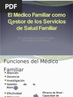 El especialista usualmente ve a los pacientes que ya han sido filtrados por el sistema y , que por lo tanto se encuentran en una categora diagnstica y pronsticadistanta de los que ve el generalista. El mdico de atencin primaria con ms experiencia en presentaciones clnicas tempranas y con un espectro mucho ms variado y numeroso que un especialista lineal es naturalmente el recurso idneo para funcionar como puerta de entrada en sistemas organizados de atencin mdica. ( ) introduccin ala practica Irigoyen menciona que la tendencia de otras especialidades como ginecologa y obstetricia ha ido disminuyendo, desde 1995, lo mismo par medicina interna hasta el 2005, al contrario de lo que pasa con medicina familiar que en 1995 tena un demanda de 1.55% y en el 2000 se increment al 7.10 % y se espera que para el 2020 alcance el 27.10% ( ) ATEN FAM 2009;16(4-5) ELEMENTOS ESENCIALES DE LA PRACTICA DE LA MEDICINA FAMILIAR: INTEGRALIDAD, CONTNIUIDAD Y ENFOQUE DE RIESGO INTEGRALIDAD Los principios de Mc Whinney mencionan que la medicina familiar estcomprometido con la persona, ms que slo el conocimiento o tcnica especial, cualquier problema de salud del paciente est en nuestro campo ,el mdico de familia se esfuerza por comprender el contexto de la enfermedad en lo personal, familiar y social, ve a sus pacientes como una oportunidad de educacin y prevencin para la salud, tiene el compromiso de mantener la salud de sus miembros sanos o enfermos, se sabe parte de un sistema coordinado de servicios de salud y sociales, idealmente puede compartir el habitad de sus pacientes conociendo sus condiciones de vida y de trabajo, ve a los paciente en el consultorio, domicilio y medio hospitalario, esta ms cercano a eventos importantes de las familias como los nacimientos, enfermedades y la muerte, tambin es un gerente de recursos, pues dentro de ciertos lmites controla la admisin hospitalaria, uso de investigaciones, las prescripciones de tratamiento y la derivacin hacia otros especialistas.( ) Profesor Dr. Julio Ceitlin CONTINUIDAD