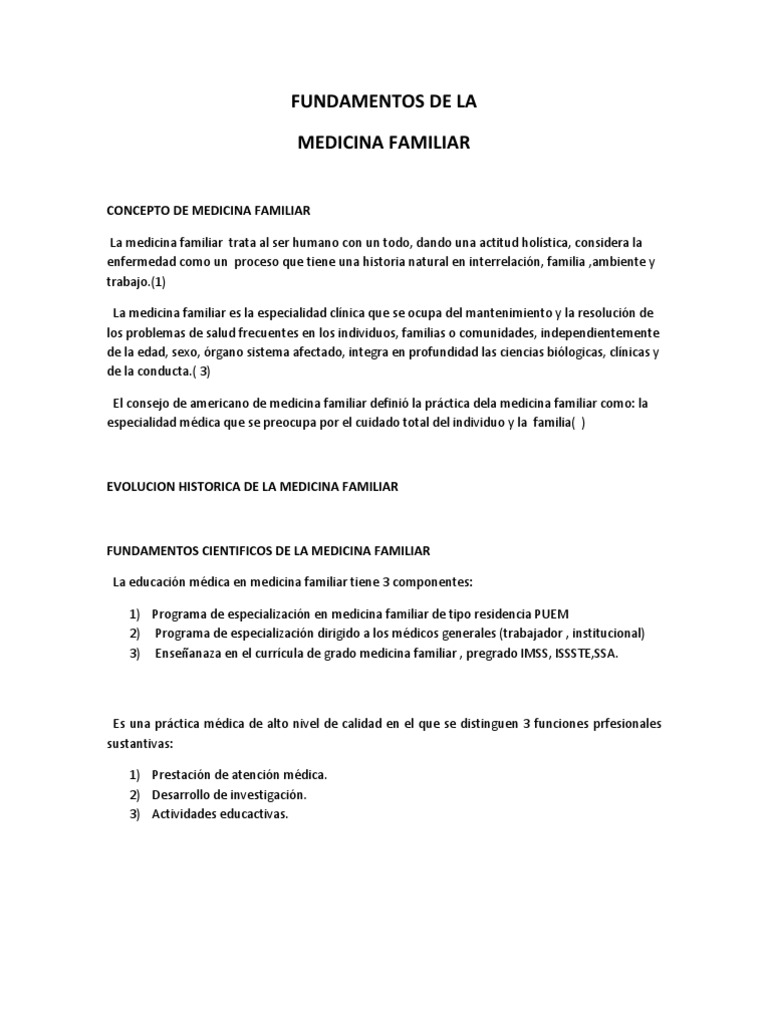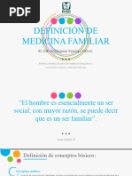 CONCEPTO DE MEDICINA FAMILIAR La medicina familiar trata al ser humano con un todo, dando una actitud holstica, considera la enfermedad como un proceso que tiene una historia natural en interrelacin, familia ,ambiente y trabajo.(1) La medicina familiar es la especialidad clnica que se ocupa del mantenimiento y la resolucin de los problemas de salud frecuentes en los individuos, familias o comunidades, independientemente de la edad, sexo, rgano sistema afectado, integra en profundidad las ciencias bilogicas, clnicas y de la conducta.( 3) El consejo de americano de medicina familiar defini la prctica dela medicina familiar como: la especialidad mdica que se preocupa por el cuidado total del individuo y la familia( )