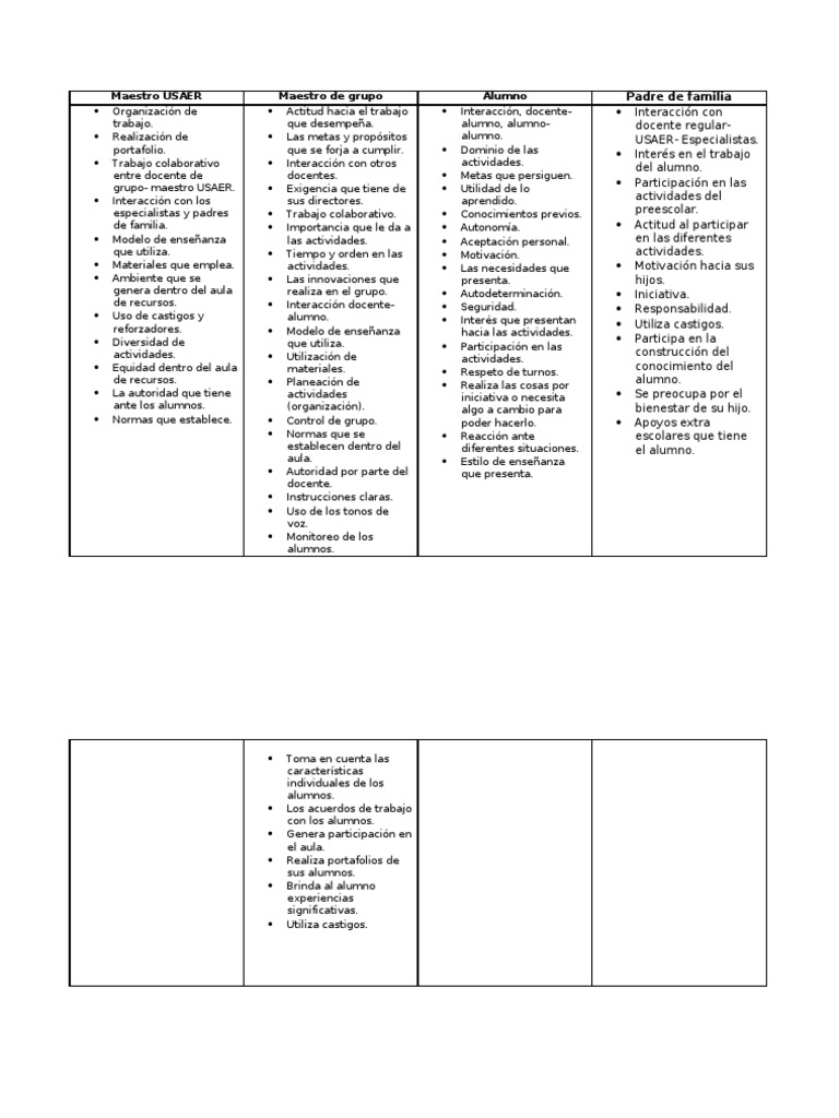 Padre de familia Interaccin con docente regularUSAER- Especialistas. Inters en el trabajo del alumno. Participacin en las actividades del preescolar. Actitud al participar en las diferentes actividades. Motivacin hacia sus hijos. Iniciativa. Responsabilidad. Utiliza castigos. Participa en la construccin del conocimiento del alumno. Se preocupa por el bienestar de su hijo. Apoyos extra escolares que tiene el alumno.