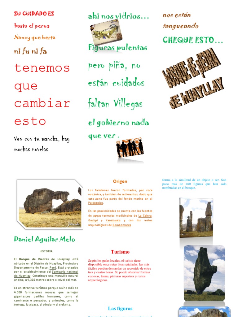 HISTORIA El Bosque de Piedras de Huayllay est ubicado en el Distrito de Huayllay, Provincia y Departamento de Pasco, Per. Est protegido por el establecimiento del Santuario nacional de Huayllay. Constituye una maravilla natural andina, a 4,310 metros sobre el nivel del mar. Es un atractivo turstico porque rene ms de 4.000 formaciones rocosas que semejan gigantescos perfiles humanos, como el caminante o pensador, y animales, como la tortuga, la alpaca, el cndor y el elefante.