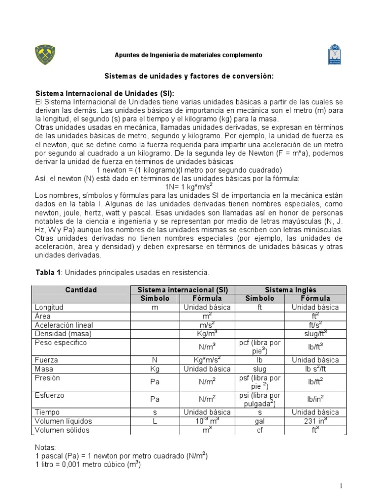 Sistemas de unidades y factores de conversin: Sistema Internacional de Unidades (SI): El Sistema Internacional de Unidades tiene varias unidades bsicas a partir de las cuales se derivan las dems. Las unidades bsicas de importancia en mecnica son el metro (m) para la longitud, el segundo (s) para el tiempo y el kilogramo (kg) para la masa. Otras unidades usadas en mecnica, llamadas unidades derivadas, se expresan en trminos de las unidades bsicas de metro, segundo y kilogramo. Por ejemplo, la unidad de fuerza es el newton, que se define como la fuerza requerida para impartir una aceleracin de un metro por segundo al cuadrado a un kilogramo. De la segunda ley de Newton (F = m*a), podemos derivar la unidad de fuerza en trminos de unidades bsicas: 1 newton = (1 kilogramo)(l metro por segundo cuadrado) As, el newton (N) est dado en trminos de las unidades bsicas por la frmula: 1N= 1 kg*m/s2 Los nombres, smbolos y frmulas para las unidades SI de importancia en la mecnica estn dados en la tabla l. Algunas de las unidades derivadas tienen nombres especiales, como newton, joule, hertz, watt y pascal. Esas unidades son llamadas as en honor de personas notables de la ciencia e ingeniera y se representan por medio de letras maysculas (N, J. Hz, W y Pa) aunque los nombres de las unidades mismas se escriben con letras minsculas. Otras unidades derivadas no tienen nombres especiales (por ejemplo, las unidades de aceleracin, rea y densidad) y deben expresarse en trminos de unidades bsicas y otras unidades derivadas. Tabla 1: Unidades principales usadas en resistencia. Cantidad Longitud rea Aceleracin lineal Densidad (masa) Peso especifico Fuerza Masa Presin Esfuerzo Tiempo Volumen lquidos Volumen slidos Sistema internacional (SI) Smbolo Frmula m Unidad bsica m2 m/s2 Kg/m3 N/m3 N Kg Pa Pa s L Kg*m/s2 Unidad bsica N/m2 N/m2 Unidad bsica 10-3 m3 m3 Sistema Ingls Smbolo Frmula ft Unidad bsica ft2 ft/s2 slug/ft3 pcf (libra por lb/ft3 pie3) lb Unidad bsica slug lb s2/ft psf (libra por lb/ft2 pie 2) psi (libra por lb/in2 pulgada2) s Unidad bsica gal 231 in3 cf ft3