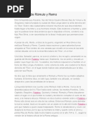 Escultura de Rmulo y Remo Monte Palatino Dice la leyenda que Ascanio, hijo del hroe troyano Eneas (hijo de Venus y de Anquises), habra fundado la ciudad de Alba Longa sobre la orilla derecha del ro Tber. Sobre esta ciudad latina reinaron muchos de sus descendientes hasta llegar a Numitor y a su hermano Amulio. ste destron a Numitor y, para que no pudiese tener descendencia que le disputase el trono, conden a su hija, Rea Silvia, a ser sacerdotisa de la diosa Vesta para que permaneciese virgen. A pesar de ello, Marte, el dios de la guerra, engendr en Rea Silvia a los mellizos Rmulo y Remo. Cuando stos nacieron y para salvarlos fueron arrojados al Tber dentro de una canasta que encall en la zona de las siete colinas situada cerca de la desembocadura del Tber, en el mar. Una loba, llamada Luperca, se acerc a beber y les recogi y amamant en su guarida del Monte Palatino hasta que, finalmente, les encontr y rescat un pastor cuya mujer los cri. Ya adultos, los mellizos repusieron a Numitor en el trono de Alba Longa y fundaron, como colonia de sta, una ciudad en la ribera derecha del Tber, en el lugar donde haban sido amamantados por la loba, para ser sus Reyes. Se dice que la loba que amamant a Rmulo y Remo fue su madre adoptiva humana. El trmino loba, en latn lupa, tambin era utilizado, en sentido despectivo, para las prostitutas de la poca. La leyenda tambin nos cuenta como Rmulo mat a Remo. Cerca de la desembocadura del ro Tber haba siete colinas: los montes Aventino, Celio, Capitolio, Esquilino, Palatino, Quirinal y Viminal. Rmulo y Remo discutieron sobre el lugar en el que fundar la ciudad y decidieron consultar el vuelo de las aves, a la manera etrusca. Rmulo vio doce buitres volando sobre el Palatino y Remo slo divis seis en otra de las colinas. Entonces Rmulo, para delimitar la nueva ciudad, traz un recuadro con un arado en lo alto del monte Palatino y jur que matara a quien osase traspasarlo. Remo le desobedeci y cruz con desprecio la lnea, por lo que su hermano le mat y qued como el nico y primer Rey de Roma. Este hecho habra ocurrido en el ao 754 a. C., segn la versin de la historia oficial de la Roma antigua. Origen griego Segn otras fuentes antiguas, la fundacin de la ciudad se relaciona con el mundo griego, ya que los fundadores tenan ascendencia troyana. Esta leyenda presenta a Eneas, prncipe troyano, como antepasado directo de Rmulo y Remo, el cual, al casarse con la hija del rey latino, se convirti a su vez en rey. Esta interpretacin la encontramos no slo en historiadores griegos, sino que tambin se defendi en el mundo itlico frente a otras tradiciones que le atribuan un origen arcadio, relacionadas con el mito de Evandro, o aqueo, relacionada con el de Odiseo o Ulises. De esta manera, la historiografa griega atribuy un origen divino y griego a la fundacin de Roma, versin asumida posteriormente por sta.