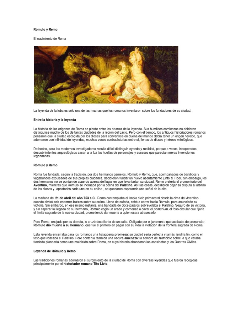 La leyenda de la loba es slo una de las muchas que los romanos inventaron sobre los fundadores de su ciudad. Entre la historia y la leyenda La historia de los orgenes de Roma se pierde entre las brumas de la leyenda. Sus humildes comienzos no debieron distinguirse mucho de los de tantas ciudades de la regin del Lacio. Pero con el tiempo, los antiguos historiadores romanos pensaron que la ciudad escogida por los dioses para convertirse en duea del mundo deba tener un origen heroico, que adornaron con infinidad de leyendas, muchas veces contradictorias entre s, llenas de dioses y hroes mitolgicos. De hecho, para los modernos investigadores resulta difcil distinguir leyenda y realidad, porque a veces, inesperados descubrimientos arqueolgicos sacan a la luz las huellas de personajes y sucesos que parecan meras invenciones legendarias. Rmulo y Remo Roma fue fundada, segn la tradicin, por dos hermanos gemelos, Rmulo y Remo, que, acompaados de bandidos y vagabundos expulsados de sus propias ciudades, decidieron fundar un nuevo asentamiento junto al Tber. Sin embargo, los dos hermanos no se ponan de acuerdo acerca del lugar en que levantaran su ciudad. Remo prefera el promontorio del Aventino, mientras que Rmulo se inclinaba por la colina del Palatino. As las cosas, decidieron dejar su disputa al arbitrio de los dioses y -apostados cada uno en su colina-, se quedaron esperando una seal de lo alto. La maana del 21 de abril del ao 753 a.C., Remo contemplaba el limpio cielo primaveral desde la cima del Aventino cuando divis seis enormes buitres sobre su colina. Lleno de euforia, ech a correr hacia Rmulo, para anunciarle su victoria. Sin embargo, en ese mismo instante, una bandada de doce pjaros sobrevolaba el Palatino. Seguro de su victoria, y sin esperar la llegada de su hermano, Rmulo cogi un arado y comenz a cavar el pomerium, el foso circular que fijara el lmite sagrado de la nueva ciudad, prometiendo dar muerte a quien osara atravesarlo. Pero Remo, enojado por su derrota, lo cruz desafiante de un salto. Obligado por el juramento que acababa de pronunciar, Rmulo dio muerte a su hermano, que fue el primero en pagar con su vida la violacin de la frontera sagrada de Roma. Esta leyenda encerraba para los romanos una halagea promesa: su ciudad sera perfecta y jams tendra fin, como el foso que rodeaba el Palatino. Pero contena tambin una oscura amenaza: la sombra del fratricidio sobre la que estaba fundada planeara como una maldicin sobre Roma, en cuya historia abundaron los asesinatos y las Guerras Civiles. Leyenda de Rmulo y Remo Las tradiciones romanas adornaron el surgimiento de la ciudad de Roma con diversas leyendas que fueron recogidas principalmente por el historiador romano Tito Livio.