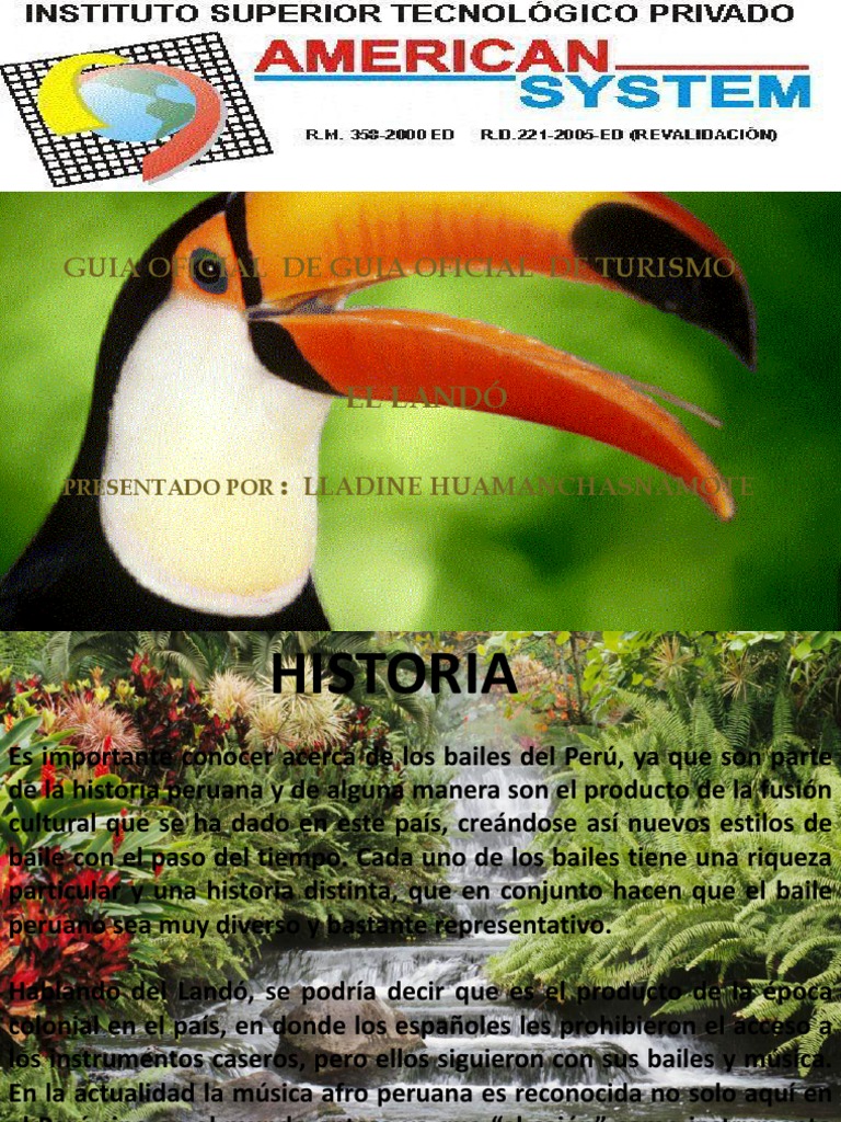 Es importante conocer acerca de los bailes del Per, ya que son parte de la historia peruana y de alguna manera son el producto de la fusin cultural que se ha dado en este pas, crendose as nuevos estilos de baile con el paso del tiempo. Cada uno de los bailes tiene una riqueza particular y una historia distinta, que en conjunto hacen que el baile peruano sea muy diverso y bastante representativo. Hablando del Land, se podra decir que es el producto de la poca colonial en el pas, en donde los espaoles les prohibieron el acceso a los instrumentos caseros, pero ellos siguieron con sus bailes y msica. En la actualidad la msica afro peruana es reconocida no solo aqu en el Per sino en el mundo entero ya que el cajn como instrumento principal de este ritmo es nico y originario del Per.
