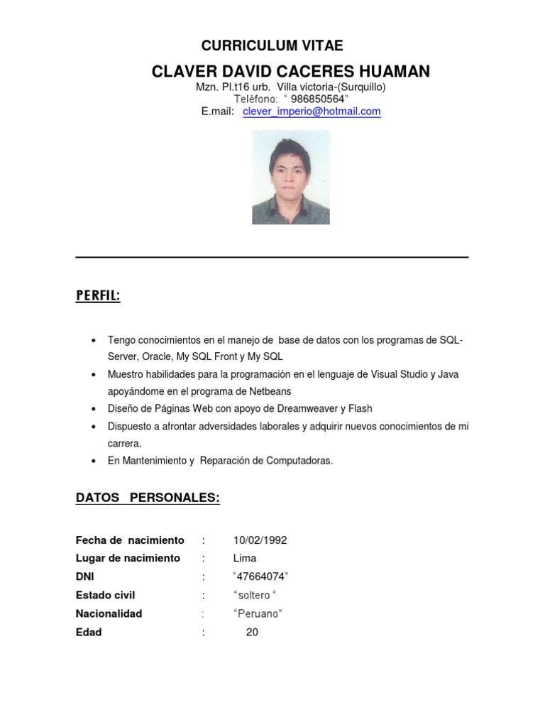 Fecha de nacimiento Lugar de nacimiento DNI Estado civil Nacionalidad Edad : : : : : : 10/02/1992 Lima 47664074 soltero Peruano 20