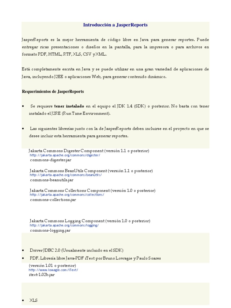 JasperReports es la mejor herramienta de cdigo libre en Java para generar reportes. Puede entregar ricas presentaciones o diseos en la pantalla, para la impresora o para archivos en formato PDF, HTML, RTF, XLS, CSV y XML. Est completamente escrita en Java y se puede utilizar en una gran variedad de aplicaciones de Java, incluyendo J2EE o aplicaciones Web, para generar contenido dinmico. Requerimientos de JasperReports Se requiere tener instalado en el equipo el JDK 1.4 (SDK) o posterior. No basta con tener instalado el J2RE (Run Time Environment). Las siguientes libreras junto con la de JasperReports deben incluirse en el proyecto en que se desee incluir esta herramienta para generar reportes. Jakarta Commons Digester Component (versin 1.1 o posterior)