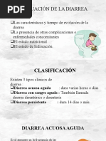 Las enfermedades diarreicas, de acuerdo con la evaluacin del estado de hidratacin, se clasifican en: casos sin deshidratacin, con deshidratacin, con choque hipovolmico por deshidratacin. Caso sin deshidratacin, es aquel que presenta generalmente menos de cuatro evacuaciones lquidas en 24 horas, ausencia de vmito, sin signos clnicos de deshidratacin. Caso con deshidratacin, es aquel que presenta dos o ms de las manifestaciones clnicas siguientes
