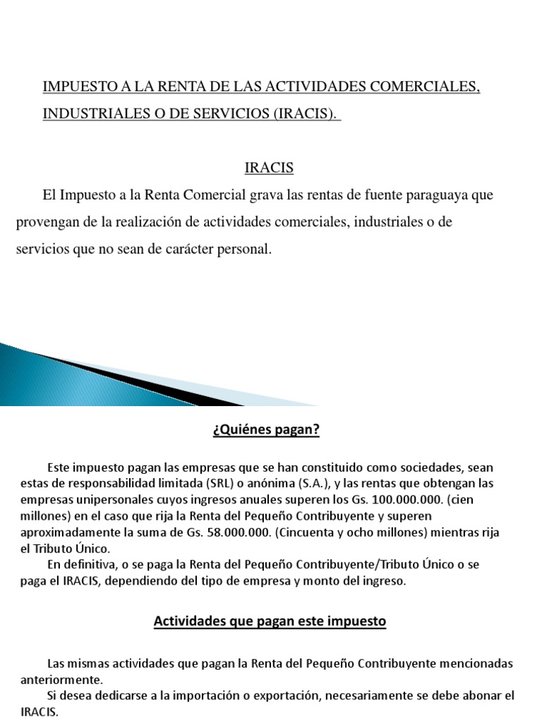Este impuesto pagan las empresas que se han constituido como sociedades, sean estas de responsabilidad limitada (SRL) o annima (S.A.), y las rentas que obtengan las empresas unipersonales cuyos ingresos anuales superen los Gs. 100.000.000. (cien millones) en el caso que rija la Renta del Pequeo Contribuyente y superen aproximadamente la suma de Gs. 58.000.000. (Cincuenta y ocho millones) mientras rija el Tributo nico. En definitiva, o se paga la Renta del Pequeo Contribuyente/Tributo nico o se paga el IRACIS, dependiendo del tipo de empresa y monto del ingreso.