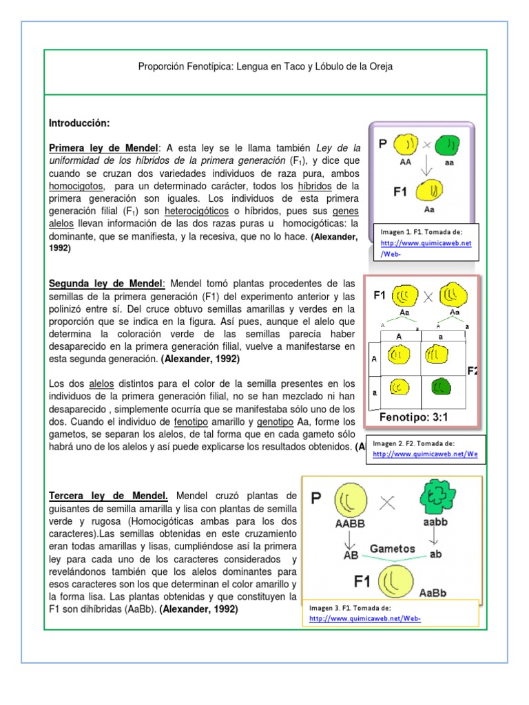 Introduccin: Primera ley de Mendel: A esta ley se le llama tambin Ley de la uniformidad de los hbridos de la primera generacin (F1), y dice que cuando se cruzan dos variedades individuos de raza pura, ambos homocigotos, para un determinado carcter, todos los hbridos de la primera generacin son iguales. Los individuos de esta primera generacin filial (F1) son heterocigticos o hbridos, pues sus genes alelos llevan informacin de las dos razas puras u homocigticas: la dominante, que se manifiesta, y la recesiva, que no lo hace. (Alexander,