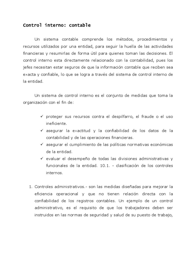 Un sistema contable comprende los mtodos, procedimientos y recursos utilizados por una entidad, para seguir la huella de las actividades financieras y resumirlas de forma til para quienes toman las decisiones. El control interno esta directamente relacionado con la contabilidad, pues los jefes necesitan estar seguros de que la informacin contable que reciben sea exacta y confiable, lo que se logra a travs del sistema de control interno de la entidad. Un sistema de control interno es el conjunto de medidas que toma la organizacin con el fin de: proteger sus recursos contra el despilfarro, el fraude o el uso ineficiente. asegurar la exactitud y la confiabilidad de los datos de la contabilidad y de las operaciones financieras. asegurar el cumplimiento de las polticas normativas econmicas de la entidad. evaluar el desempeo de todas las divisiones administrativas y funcionales de la entidad. 10.1. - clasificacin de los controles internos. 1. Controles administrativos.- son las medidas diseadas para mejorar la eficiencia operacional y que no tienen relacin directa con la confiabilidad de los registros contables. Un ejemplo de un control administrativo, es el requisito de que los trabajadores deben ser instruidos en las normas de seguridad y salud de su puesto de trabajo,