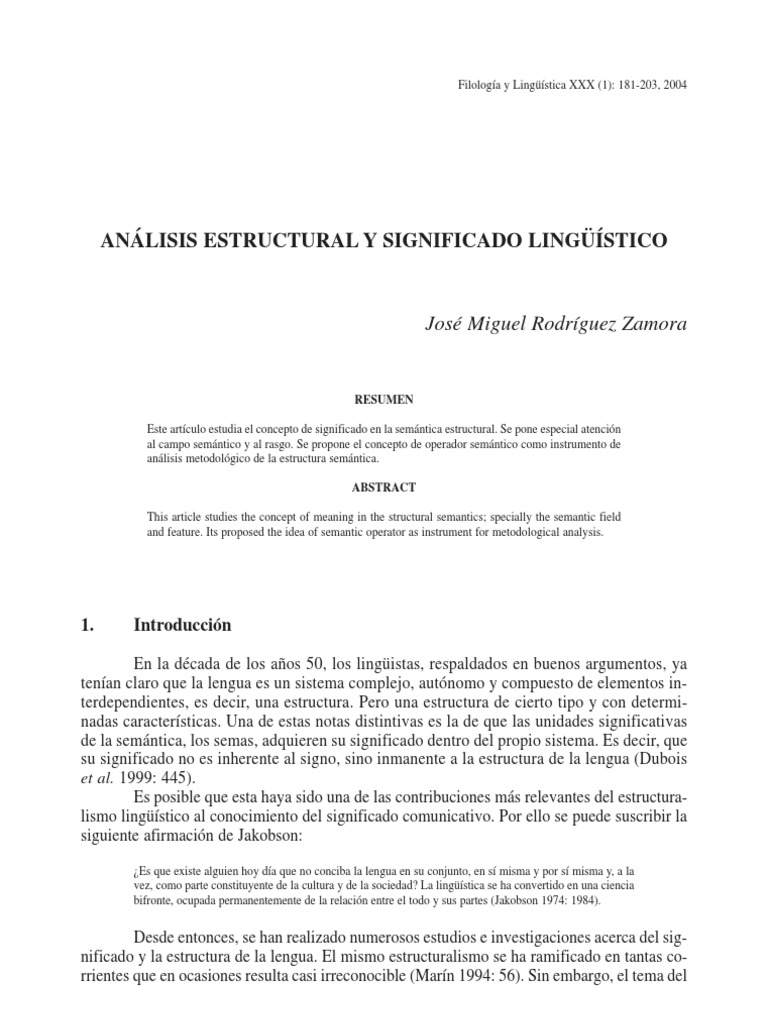 significado lingstico an est lejos de ser totalmente resuelto. Todo lo contrario, en la actualidad parece an ms complejo y cada vez ms relevante para la lingstica (Alcarz Var 1997: 517). Cmo se construye el significado lingstico?Qu funcin desempea el anlisis estructural en este proceso? En el presente artculo se propondr una va de solucin a este problema. 2. Anlisis componencial y rasgo semntico
