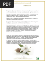 4.- materiales: Desmotadora Bolsa de papel (pequeo y grande) Balanza Nota de apuntes Algodn del campo (10 muestras x bolsa) 5.- Mtodos: Primero se fue al campo a tomar 3 muestras de algodn, la cual contendr cada una 10 bellotas, escogidas al azar y de preferencia del centro. Luego, luego se evaluara los pesos de cada bellota, antes de pasarlo por la desmotadora. Al final se tomara nota de los pesos de fibra, peso de la semilla y se calcular los caracteres productivos del algodn evaluado. 6.- Resultados: De las 3 muestras (cada una con 10 bellotas) 1.- peso de bellotas(10) = 38.5 gramos 2.- peso de fibra = 15.1 gramos 3.- peso de semilla = 23.4 gramos 4.- % de fibra = P. fibra = 15.1x100 = 39.2% P. bellota 38.5 5.- Acude = P. bellota = 38.5 = 2.54% P. de fibra 15.1 6.- N de semillas en 10 bellotas =209 7.- ndice de fibra = %. fibra x Peso en gramos de 100 semillas. %.semilla Indice de fibra = 15.1 x (11.19) = 7.2 23.4 Indice de fibra = 209 Semillas ---------- 15.1 gramos 100 semillas ----------- x X = 7.2 8.- indice de semillas: