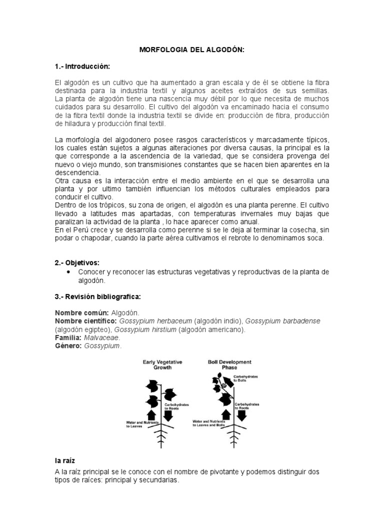- Introduccin: El algodn es un cultivo que ha aumentado a gran escala y de l se obtiene la fibra destinada para la industria textil y algunos aceites extrados de sus semillas. La planta de algodn tiene una nascencia muy dbil por lo que necesita de muchos cuidados para su desarrollo. El cultivo del algodn va encaminado hacia el consumo de la fibra textil donde la industria textil se divide en: produccin de fibra, produccin de hiladura y produccin final textil. La morfologa del algodonero posee rasgos caractersticos y marcadamente tpicos, los cuales estn sujetos a algunas alteraciones por diversa causas, la principal es la que corresponde a la ascendencia de la variedad, que se considera provenga del nuevo o viejo mundo, son transmisiones constantes que se hacen bien aparentes en la descendencia. Otra causa es la interaccin entre el medio ambiente en el que se desarrolla una planta y por ultimo tambin influencian los mtodos culturales empleados para conducir el cultivo. Dentro de los trpicos, su zona de origen, el algodn es una planta perenne. El cultivo llevado a latitudes mas apartadas, con temperaturas invernales muy bajas que paralizan la actividad de la planta , lo hace aparecer como anual. En el Per crece y se desarrolla como perenne si se le deja al terminar la cosecha, sin podar o chapodar, cuando la parte area cultivamos el rebrote lo denominamos soca. 2.- Objetivos: Conocer y reconocer las estructuras vegetativas y reproductivas de la planta de algodn. 3.- Revisin bibliografica: Nombre comn: Algodn. Nombre cientfico: Gossypium herbaceum (algodn indio), Gossypium barbadense (algodn egipteo), Gossypium hirstium (algodn americano). Familia: Malvaceae. Gnero: Gossypium.