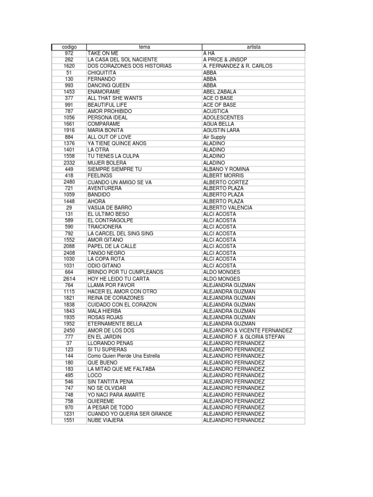 artista A HA A PRICE & JINSOP A. FERNANDEZ & R. CARLOS ABBA ABBA ABBA ABEL ZABALA ACE O BASE ACE OF BASE ACUSTICA ADOLESCENTES AGUA BELLA AGUSTIN LARA Air Supply ALADINO ALADINO ALADINO ALADINO ALBANO Y ROMINA ALBERT MORRIS ALBERTO CORTEZ ALBERTO PLAZA ALBERTO PLAZA ALBERTO PLAZA ALBERTO VALENCIA ALCI ACOSTA ALCI ACOSTA ALCI ACOSTA ALCI ACOSTA ALCI ACOSTA ALCI ACOSTA ALCI ACOSTA ALCI ACOSTA ALCI ACOSTA ALDO MONGES ALDO MONGES ALEJANDRA GUZMAN ALEJANDRA GUZMAN ALEJANDRA GUZMAN ALEJANDRA GUZMAN ALEJANDRA GUZMAN ALEJANDRA GUZMAN ALEJANDRA GUZMAN ALEJANDRO & VICENTE FERNANDEZ ALEJANDRO F. & GLORIA STEFAN ALEJANDRO FERNANDEZ ALEJANDRO FERNANDEZ ALEJANDRO FERNANDEZ ALEJANDRO FERNANDEZ ALEJANDRO FERNANDEZ ALEJANDRO FERNANDEZ ALEJANDRO FERNANDEZ ALEJANDRO FERNANDEZ ALEJANDRO FERNANDEZ ALEJANDRO FERNANDEZ ALEJANDRO FERNANDEZ ALEJANDRO FERNANDEZ ALEJANDRO FERNANDEZ