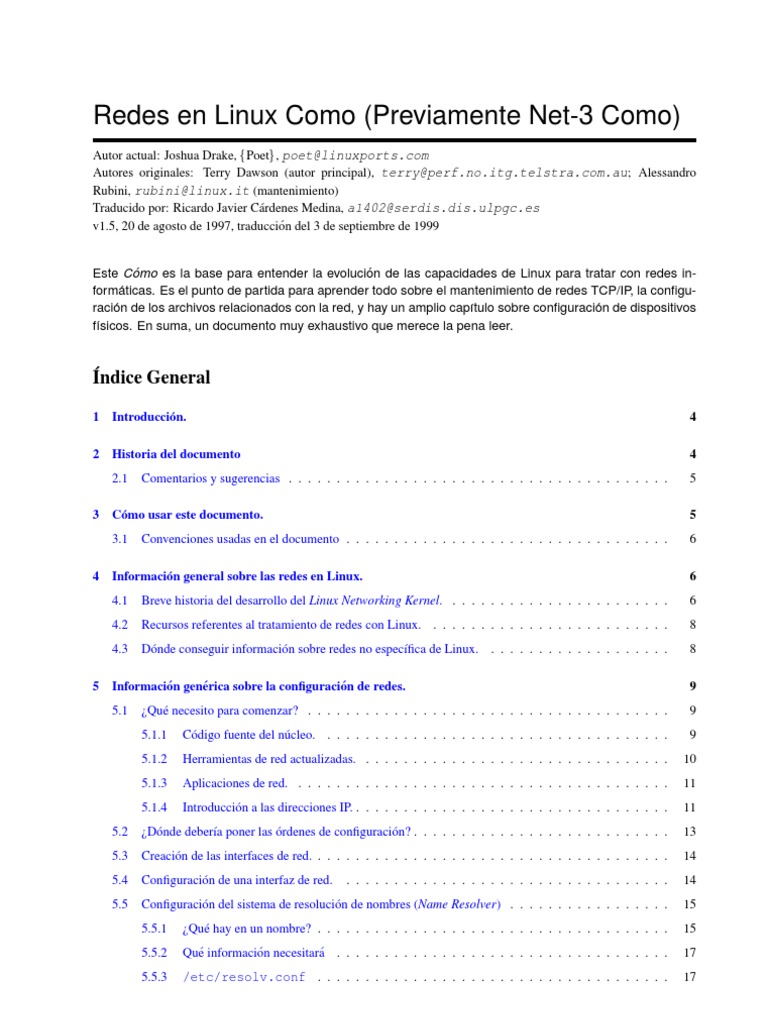 Este Como es la base para entender la evolucion de las capacidades de Linux para tratar con redes in formaticas. Es el punto de partida para aprender todo sobre el mantenimiento de redes TCP/IP, la congu racion de los archivos relacionados con la red, y hay un amplio captulo sobre conguracion de dispositivos fsicos. En suma, un documento muy exhaustivo que merece la pena leer.