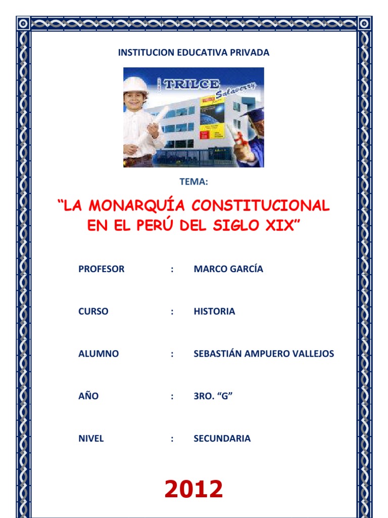 INTRODUCCIN ............................................................................................... 2 LA MONARQUA CONSTITUCIONAL EN EL PER DEL SIGLO XIX .... 3 CONCEPTO .................................................................................................... 3 PREPARANDO LA MONARQUIA................................................................... 3 PROGRAMA POLTICO DE SAN MARTN .................................................... 4 DESPRESTIGIO DEL GOBIERNO DEL PROTECTORADO ........................ 10 SAN MARTN QUERA PARA EL PER UNA MONARQUA CONSTITUCIONAL ...................................................................................... 10 LA DISCUTIBLE TERCERA ETAPA DEL MONARQUISMO DE SAN MARTN EN EL PER: EL REY JOS ..................................................................... 11 CONCLUSIONES .......................................................................................... 13 BIBLIOGRAFA .............................................................................................. 14 INDICE ............................................................................................................ 15