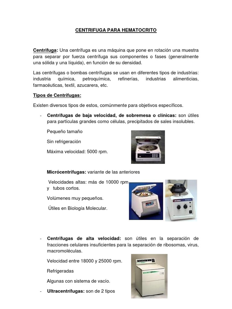 Centrifuga: Una centrfuga es una mquina que pone en rotacin una muestra para separar por fuerza centrfuga sus componentes o fases (generalmente una slida y una lquida), en funcin de su densidad. Las centrfugas o bombas centrfugas se usan en diferentes tipos de industrias: industria qumica, petroqumica, refineras, industrias alimenticias, farmacuticas, textil, azucarera, etc. Tipos de Centrifugas: Existen diversos tipos de estos, comnmente para objetivos especficos. Centrifugas de baja velocidad, de sobremesa o clnicas: son tiles para partculas grandes como clulas, precipitados de sales insolubles. Pequeo tamao Sin refrigeracin Mxima velocidad: 5000 rpm.