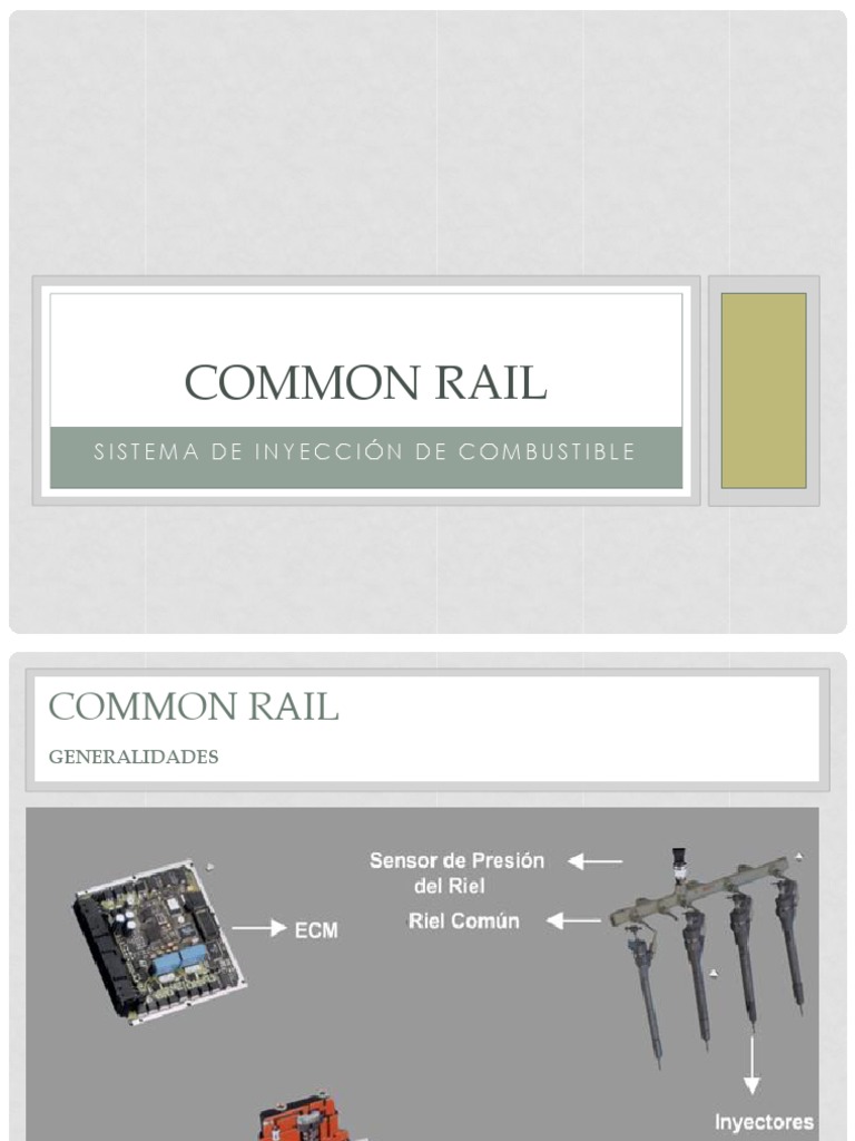 -El sistema 'Common Rail' es un sistema de control electrnico de la inyeccin de combustible del motor diesel. -Una alta presin de combustible est disponible en forma constante para todo estado de funcionamiento del motor. -La generacin y control de la alta presin son independientes del control de inyeccin. -La presin y el tiempo de inyeccin de combustible estn diseados para motores de inyeccin directa de alta velocidad. -Los parmetros de inyeccin tales como distribucin de inyeccin, cantidad de inyeccin y presin de combustible se controlan mediante el Mdulo de Control Electrnico (ECM).