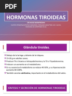 * Yodacin de la tirosina y formacin de las hormonas tiroideas: <<organificacion>> de la tiroglobulina. La unin del yodo a la molecula de tiroglobulina recibe el nombre de organificacion de la tiroglobulina. El yodo oxidado se une al aminocido tirosina. En las clulas tiroideas el yodo oxidado se asocia a la enzima tiroidea peroxidasa. El principal producto hormonal de la reaccin de acoplamiento es la molecula tiroxina (T4) se forma cuando se unen dos molculas de diyodotirosina. Una molecula de monoyodotirosina se une con una de diyodotirosina para formar triyodotironina (T3). * Almacenamiento de la tiroglobulina. La glandula tiroides tiene la capacidad de almacenar grandes cantidades de hormona. * Liberacin de tiroxina y triyodotironina del tiroides. La superficie apical de las clulas tiroideas tiene extensiones en forma de seudpodos que rodean a pequeas porciones del coloide constituyendo vesculas de pinocitosis, los lisosomas del citoplasmas se funden con las vesculas y forman vesculas digestivas que contienen enzimas mezcladas con el coloide. Difunden a travs de la base de la celula tiroidea hacia los capilares circundantes y asi pasan a la sangre. * Secrecin diaria de tiroxina y triyodotironina. La tiroxina se desyoda con lentitud y forma mas triyodotironina la hormona liberada en ultima instancia a los tejidos es triyodotironina. * Transporte de tiroxina y triyodotironina a los tejidos. La tiroxina y la triyodotironina estn unidos a protenas plasmticas sintetizadas por el hgado, estas protenas son: la globulina fijadora de la tiroxina y en menor medida, la prealbumina y la albumina fijadora de la tiroxina. * La tiroxina y la triyodotironina se liberan lentamente a las clulas de los tejidos. Al entrar en las clulas la tiroxina y la triyodotironina se unen a las protenas intracelulares, la tiroxina lo hace con mas fuerza, vuelven a almacenar en las propias clulas dianas y se utilizan con lentitud a lo largo de periodos de das o semanas. Funciones fisiolgicas de las hormonas tiroideas Las hormonas tiroideas aumentan la transcripcin de una gran cantidad de genes. Casi toda la tiroxina secretada por el tiroides se convierte en triyodotironina. * Las hormonas tiroideas activan receptores nucleares. * Las hormonas tiroideas aumentan la actividad metabolica celular . El metabolismo basal se incrementa entre el 60% y 100% por encima del valor normal cuando las concentraciones hormonales son altas. La velocidad para utilizar alimentos como fuente de energa se encuentra muy acelerada. La sntesis de proteina aumenta, tambin lo hace el catabolismo proteico. Los procesos mentales se estimulan y las actividades de las glndulas endocrinas se potencian. * Las hormonas tiroideas incrementan el numero y la actividad de las mitocondrias. * Las hormonas tiroideas facilitan el transporte activo de iones a travs de la membrana celular. * Efecto de las hormonas tiroideas sobre el crecimiento: se manifiesta en los nios de edad de desarrollo, con hipotiroides el crecimiento es mas lento y en hipertiroides es excesivo, si no se aplica un tratamiento tiroideo especifico en los primeros das o semanas de vida, en nio que carece de glandula tiroides presentara un retraso mental.