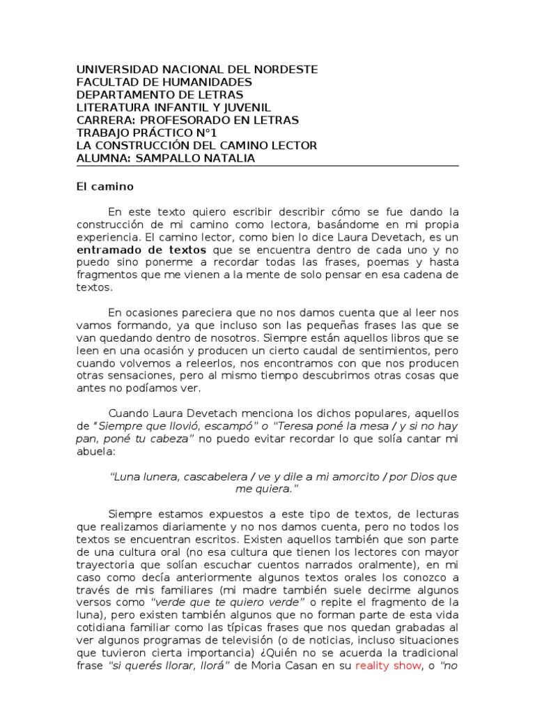PRCTICO N1 LA CONSTRUCCIN DEL CAMINO LECTOR ALUMNA: SAMPALLO NATALIA El camino En este texto quiero escribir describir cmo se fue dando la construccin de mi camino como lectora, basndome en mi propia experiencia. El camino lector, como bien lo dice Laura Devetach, es un entramado de textos que se encuentra dentro de cada uno y no puedo sino ponerme a recordar todas las frases, poemas y hasta fragmentos que me vienen a la mente de solo pensar en esa cadena de textos. En ocasiones pareciera que no nos damos cuenta que al leer nos vamos formando, ya que incluso son las pequeas frases las que se van quedando dentro de nosotros. Siempre estn aquellos libros que se leen en una ocasin y producen un cierto caudal de sentimientos, pero cuando volvemos a releerlos, nos encontramos con que nos producen otras sensaciones, pero al mismo tiempo descubrimos otras cosas que antes no podamos ver. Cuando Laura Devetach menciona los dichos populares, aquellos de Siempre que llovi, escamp o Teresa pon la mesa / y si no hay pan, pon tu cabeza no puedo evitar recordar lo que sola cantar mi abuela: Luna lunera, cascabelera / ve y dile a mi amorcito / por Dios que me quiera. Siempre estamos expuestos a este tipo de textos, de lecturas que realizamos diariamente y no nos damos cuenta, pero no todos los textos se encuentran escritos. Existen aquellos tambin que son parte de una cultura oral (no esa cultura que tienen los lectores con mayor trayectoria que solan escuchar cuentos narrados oralmente), en mi caso como deca anteriormente algunos textos orales los conozco a travs de mis familiares (mi madre tambin suele decirme algunos versos como verde que te quiero verde o repite el fragmento de la luna), pero existen tambin algunos que no forman parte de esta vida cotidiana familiar como las tpicas frases que nos quedan grabadas al ver algunos programas de televisin (o de noticias, incluso situaciones que tuvieron cierta importancia) Quin no se acuerda la tradicional frase si quers llorar, llor de Moria Casan en su reality show, o no