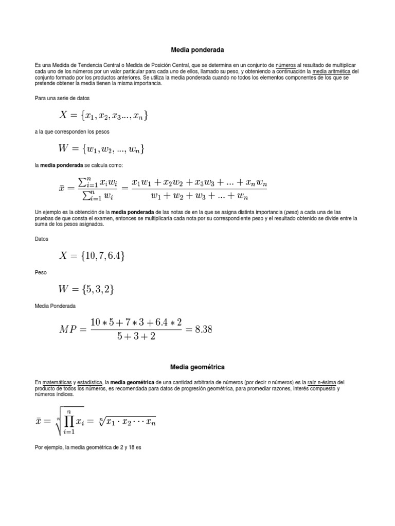 Solo es relevante la media geomtrica si todos los nmeros son positivos. Como hemos visto, si uno de ellos es 0, entonces el resultado es 0. Si hubiera un nmero negativo (o una cantidad impar de ellos) entonces la media geomtrica sera o bien negativa, o bien inexistente en los nmeros reales. En muchas ocasiones se utiliza su trasformacin en el manejo estadstico de variables con distribucin no normal. La media geomtrica es relevante cuando varias cantidades son multiplicadas para producir un total. Media geomtrica ponderada Al igual que en una media aritmtica pueden introducirse pesos como valores multiplicativos para cada uno de los valores con el fin de ponderar o hacer pesar ms en el resultado final ciertos valores, en la media geomtrica pueden introducirse pesos como exponentes: