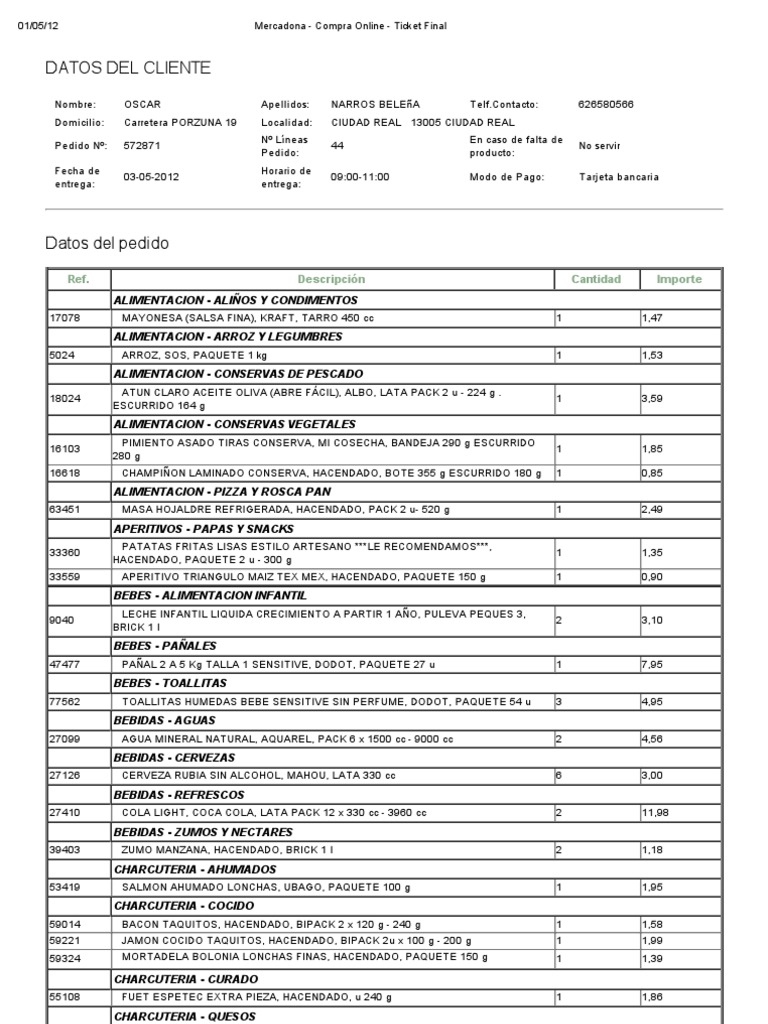 Nombre: Domicilio: Pedido N: Fecha de entrega: OSCAR Carretera PORZUNA 19 572871 03-05-2012 Apellidos: Localidad: N Lneas Pedido: Horario de entrega: NARROS BELEA Telf.Contacto: En caso de falta de producto: Modo de Pago: 626580566 CIUDAD REAL 13005 CIUDAD REAL 44 09:00-11:00 No servir Tarjeta bancaria