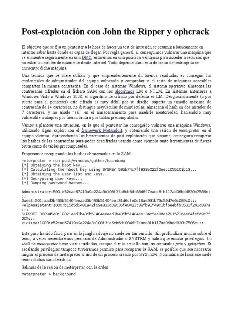 El objetivo que se fija un pentester a la hora de hacer un test de intrusin se resumira bsicamente en intentar saber hasta donde es capaz de llegar. Por regla general, si conseguimos vulnerar una mquina que se encuentre seguramente en una DMZ, estaremos en una posicin ventajosa para acceder a recursos que no estn accesibles directamente desde Internet. Todo depende claro est de cmo de restringida se encuentre dicha mquina. Una tcnica que se suele utilizar y que sorprendentemente da buenos resultados es conseguir las credenciales de administrador del equipo vulnerado y comprobar si el resto de mquinas accesibles comparten la misma contrasea. En el caso de sistemas Windows, el sistema operativo almacena las contraseas cifradas en el fichero SAM con los algoritmos LM o NTLM. En sistemas anteriores a Windows Vista o Windows 2008, el algoritmo de cifrado por defecto es LM. Desgraciadamente (o por suerte para el pentester) este cifrado es muy dbil por su diseo: soporta un tamao mximo de contrasea de 14 caracteres, no distingue maysculas de minsculas, almacena el hash en dos mitades de 7 caracteres, y no aade sal en el almacenamiento para aadirle aleatoriedad, hacindolo muy vulnerable a ataques por fuerza bruta o por tablas precomputadas. Vamos a plantear una situacin, en la que el pentester ha conseguido vulnerar una mquina Windows, utilizando algn exploit con el framework Metasploit, y obteniendo una sesin de meterpreter en el equipo vctima. Aprovechando las herramientas de post-explotacin que dispone, conseguir recuperar los hashes de las contraseas para poder descifrarlas usando como ejemplo tanto herramientas de fuerza bruta como de tablas precomputadas. Empezamos recuperando los hashes almacenados en la SAM: