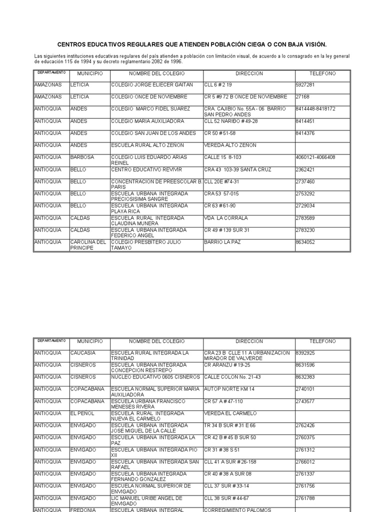 Las siguientes instituciones educativas regulares del pas atienden a poblacin con limitacin visual, de acuerdo a lo consagrado en la ley general de educacin 115 de 1994 y su decreto reglamentario 2082 de 1996.
