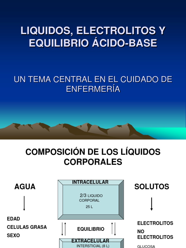 objetivo primordial consiste en la correccin del equilibrio hidroelectroltico alterado El manejo de este tipo de tratamiento requiere unos conocimientos precisos sobre la distribucin de lquidos corporales y la fisiopatologa de los desequilibrios hidroelectrolticos y cido bsico. El conocimiento de estos fundamentos permitir adoptar las medidas oportunas en cada circunstancia eligiendo de forma correcta el tipo de solucin intravenosa y el ritmo de administracin adecuados para cada circunstancia