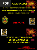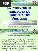 1. Anlisis de la documentacin 2. Verificacin de las caractersticas generales o universales como marca, modelo, clase, tipo, color, ao de fabricacin. 3. Ubicacin de los campos numricos. 4. Reconocimiento de las caractersticas fsicas de los NIV y VIN. 5. Aplicacin de los mtodos apropiados para la restauracin de los nmeros seriales o inscripciones borradas. B. IMPORTANCIA El conocimiento tcnico de la identificacin vehicular es fundamental, ya que si se aplica adecuadamente los mtodos y procedimientos se logra: 1. La recuperacin de vehculos robados, clonados (sic) o irregulares. 2. Orienta el proceso investigatorio policial o del Ministerio Pblico. 3. Agiliza y simplifica la intervencin policial. 4. Reduce el margen de error al momento de la intervencin. 5. Conduce a la imparcialidad. 6. Evita el abuso de autoridad. III. DEFINICION DE LOS TERMINOS USADOS EN LA IDENTIFICACION VEHICULAR PERITAJE: Diligencia realizada por el experto que tiene a cargo la investigacin, quien plasmara sus resultados en un dictamen que servir como elemento de prueba en una accin legal. NIV: Abreviatura en castellano que significanmeros identificatorios del vehculo. Se refiere a los nmeros oficiales como la placa de rodaje, nmero de serie y de motor, adems de los confidenciales, localizados en las autopartes y accesorios del vehculo, los que lo singularizan. VIN: Abreviatura de las palabras inglesasvehicle identification number. Se refiere al nmero identificatorio del vehculo (nmero de serie). Aparece en los Estados Unidos de Amrica a mediados del ao 1980, generalizndose entre los fabricantes y ensambladores estadounidenses y europeos en 1983 a travs del Organismo Internacional de Estandarizaciones (ISO 3779, ISO 3780, ISO 4030). Su importancia radica en que singulariza al vehculo en su conjunto. CARCTER: Letra o signo que, codificadamente, representa una informacin o caracterstica tcnica del vehculo. CARACTERES SUBYACENTES: Letras o signos que fueron borrados y que se encuentran debajo del nivel de la superficie.