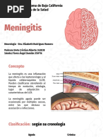GENERALIDADES Epidemiologa: Afecta en cualquier edad, los factores de riesgo son Edad: en la infancia y niez temprana o en mayores de 60 aos Inmunodeprimidos (VIH, DM2, IRC) Alcoholismo Asinamiento Disfuncin esplnica (mayor por neumococo) Etiologa Viral: La meningitis viral representa el 80% de las meningitis. 1. Enterovirus (echo y coxsackie): producen del 8595% de los casos. + en Nios, puede ocurrir ms de una vez, con serotipos diferentes. Causa ms comn de meningitis. 2. Arbovirus: Virus de la encefalitis de St. Louis, California y virus del Oeste del Nilo. 3. Papera: Puede ocurrir meningitis en ausencia de parotiditis clnica. 2-5:1 (5-9 aos) 4. Virus de la meningitis coriolinfoctica: contacto con los roedores o sus excretas. Ingesta de alimentos contaminados con orina de los roedores y exposicin de heridas abiertas a la suciedad.