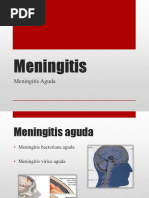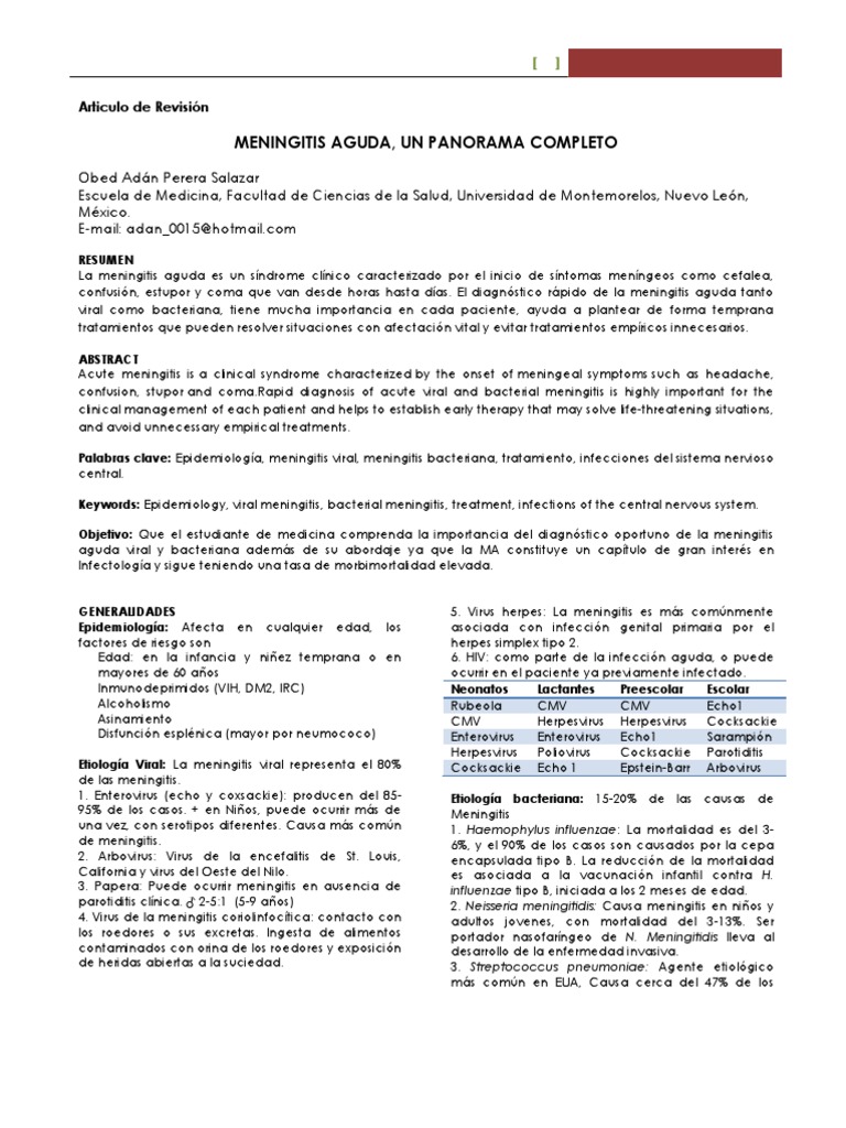 RESUMEN La meningitis aguda es un sndrome clnico caracterizado por el inicio de sntomas menngeos como cefalea, confusin, estupor y coma que van desde horas hasta das. El diagnstico rpido de la meningitis aguda tanto viral como bacteriana, tiene mucha importancia en cada paciente, ayuda a plantear de forma temprana tratamientos que pueden resolver situaciones con afectacin vital y evitar tratamientos empricos innecesarios. ABSTRACT Acute meningitis is a clinical syndrome characterized by the onset of meningeal symptoms such as headache, confusion, stupor and coma.Rapid diagnosis of acute viral and bacterial meningitis is highly important for the clinical management of each patient and helps to establish early therapy that may solve life-threatening situations, and avoid unnecessary empirical treatments. Palabras clave: Epidemiologa, meningitis viral, meningitis bacteriana, tratamiento, infecciones del sistema nervioso central. Keywords: Epidemiology, viral meningitis, bacterial meningitis, treatment, infections of the central nervous system. Objetivo: Que el estudiante de medicina comprenda la importancia del diagnstico oportuno de la meningitis aguda viral y bacteriana adems de su abordaje ya que la MA constituye un captulo de gran inters en Infectologa y sigue teniendo una tasa de morbimortalidad elevada.